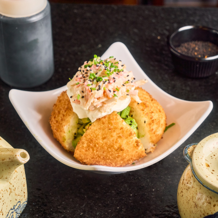 Camarones empanizados, rellenos de queso philadelphia, ensalada de cangrejo y aguacate.