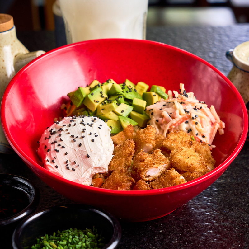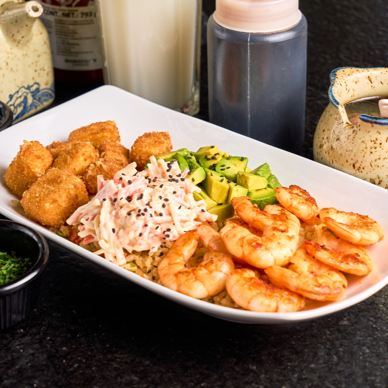 Arroz frito, camarón empanizado, ensalada de cangrejo, aguacate y queso philadelphia.