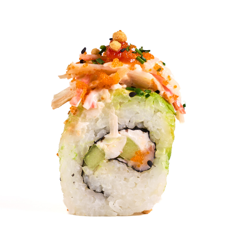 POR DENTRO: CAMARON, PEPINO Y PHILADELPHIA. POR FUERA: AGUACATE. TOPPING: ENSALADA DE SURIMI, ARARE, MASAGO, SRIRACHA, AJONJOLI Y CEBOLLIN