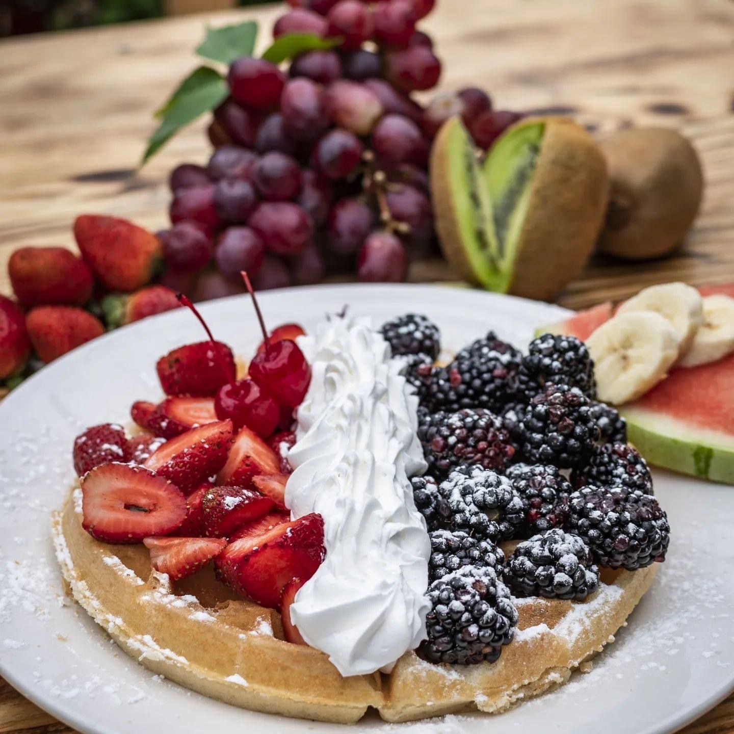 1 pza De waffle con fruta (fresa, melón, uva, zarzamora y kiwi) con crema batida cereza y miel maple.