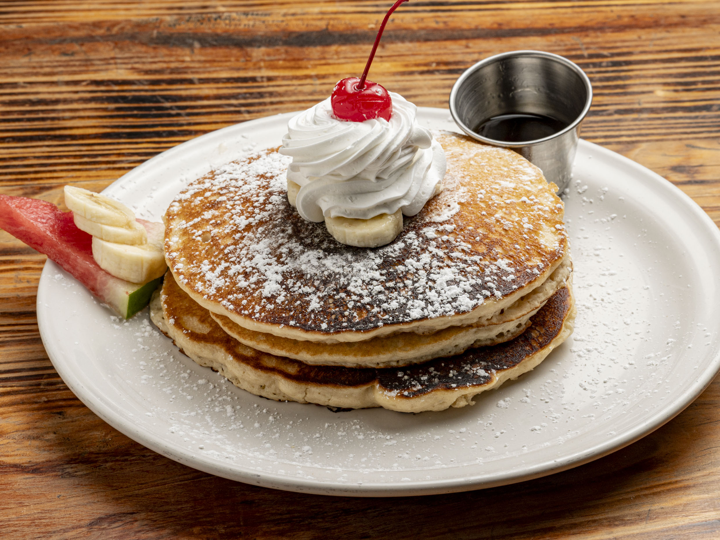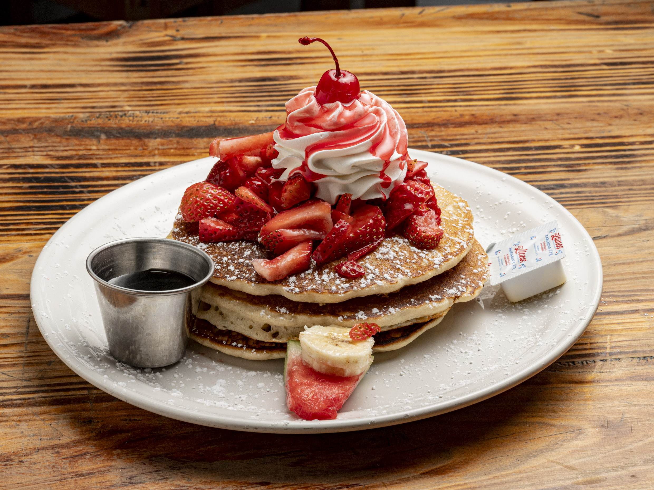 3 pzas De hot cakes con fresas, crema batida cereza y miel maple.