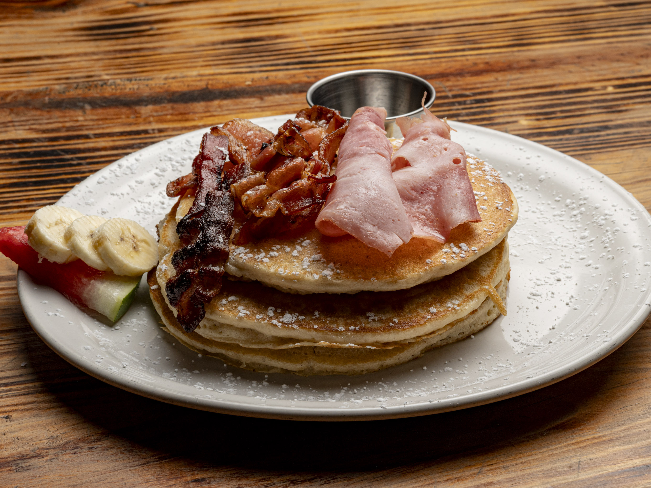 3 pzas De hot cakes naturales con jamón y tocino acompañado de miel maple.