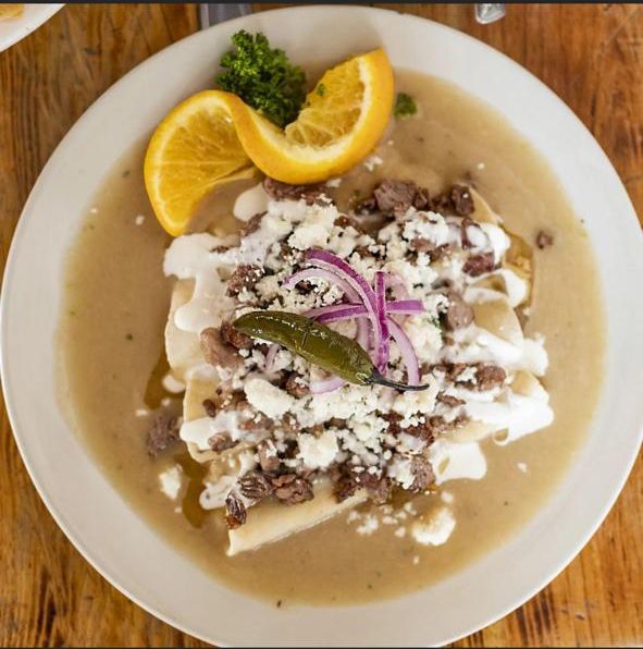 Totopos bañados en salsa de poblano cremosa, acompañado de frijoles crema, queso, cebolla, chile toreado.
