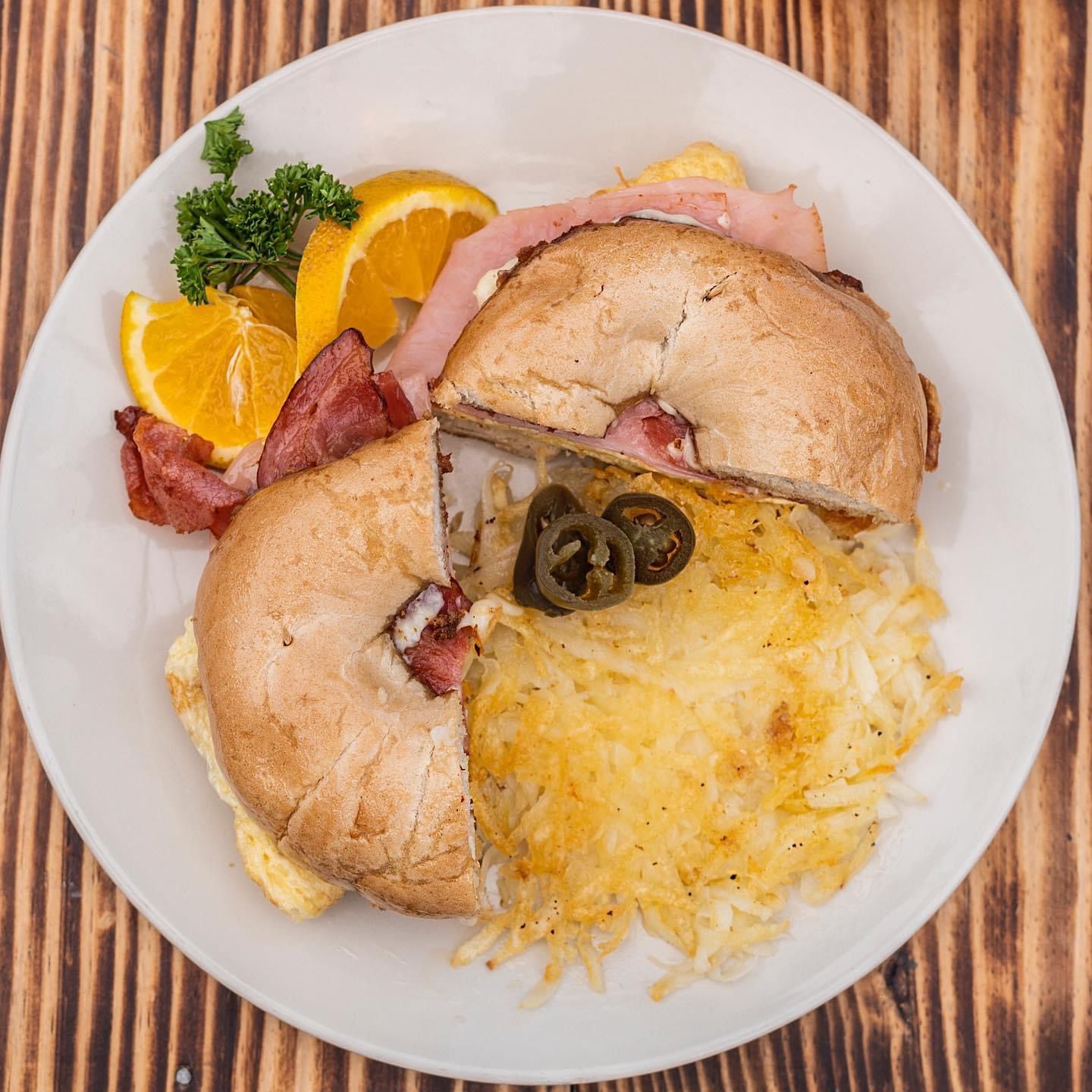 1 pza De bagel 1 torta de huevo, jamón, tocino, queso amarillo, con mayonesa. acompañado de papa rayada a la plancha con mantequilla.