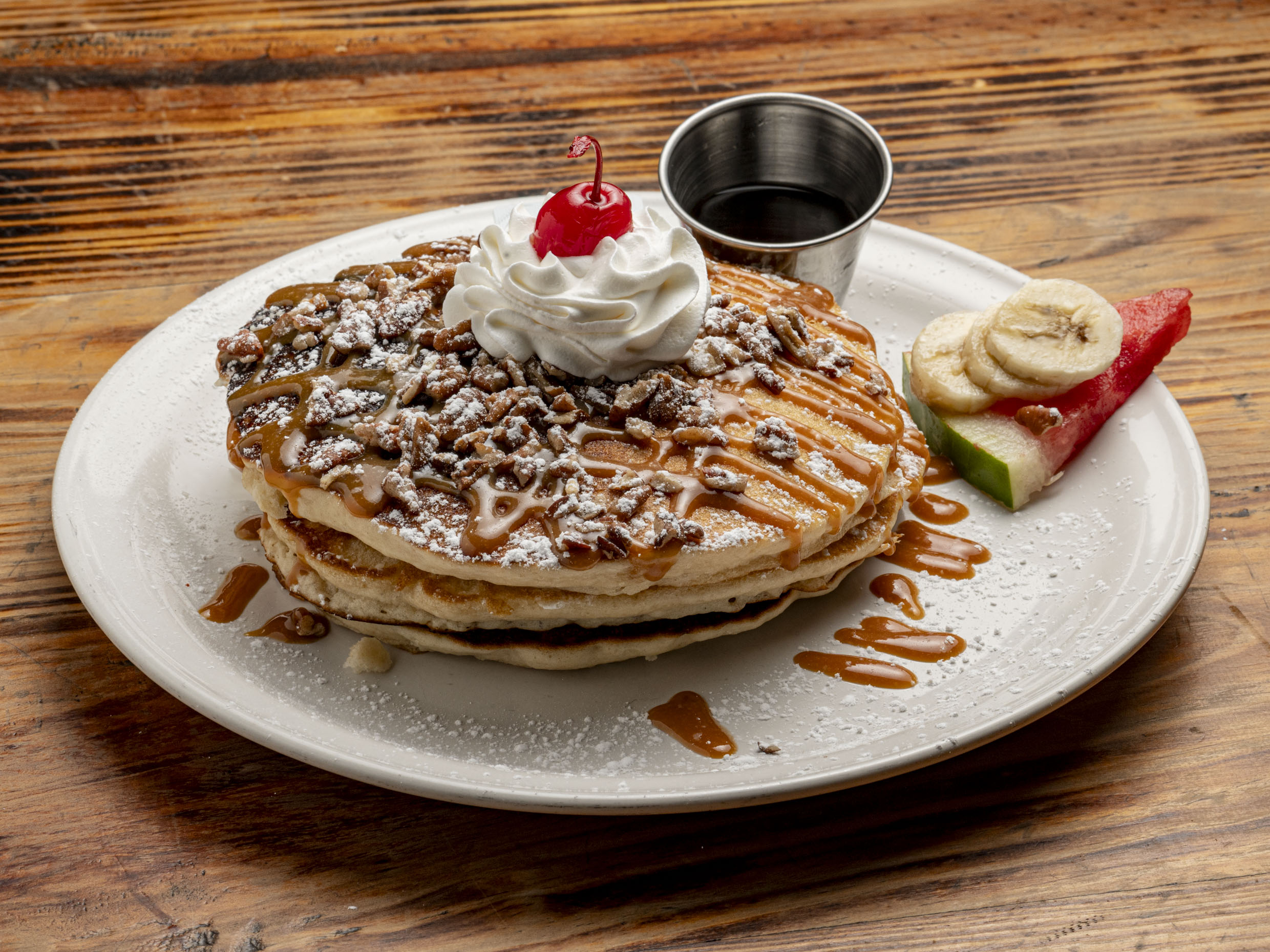 3 pzas De hot cakes con cajeta, nuez, crema batida y cereza, con miel maple.