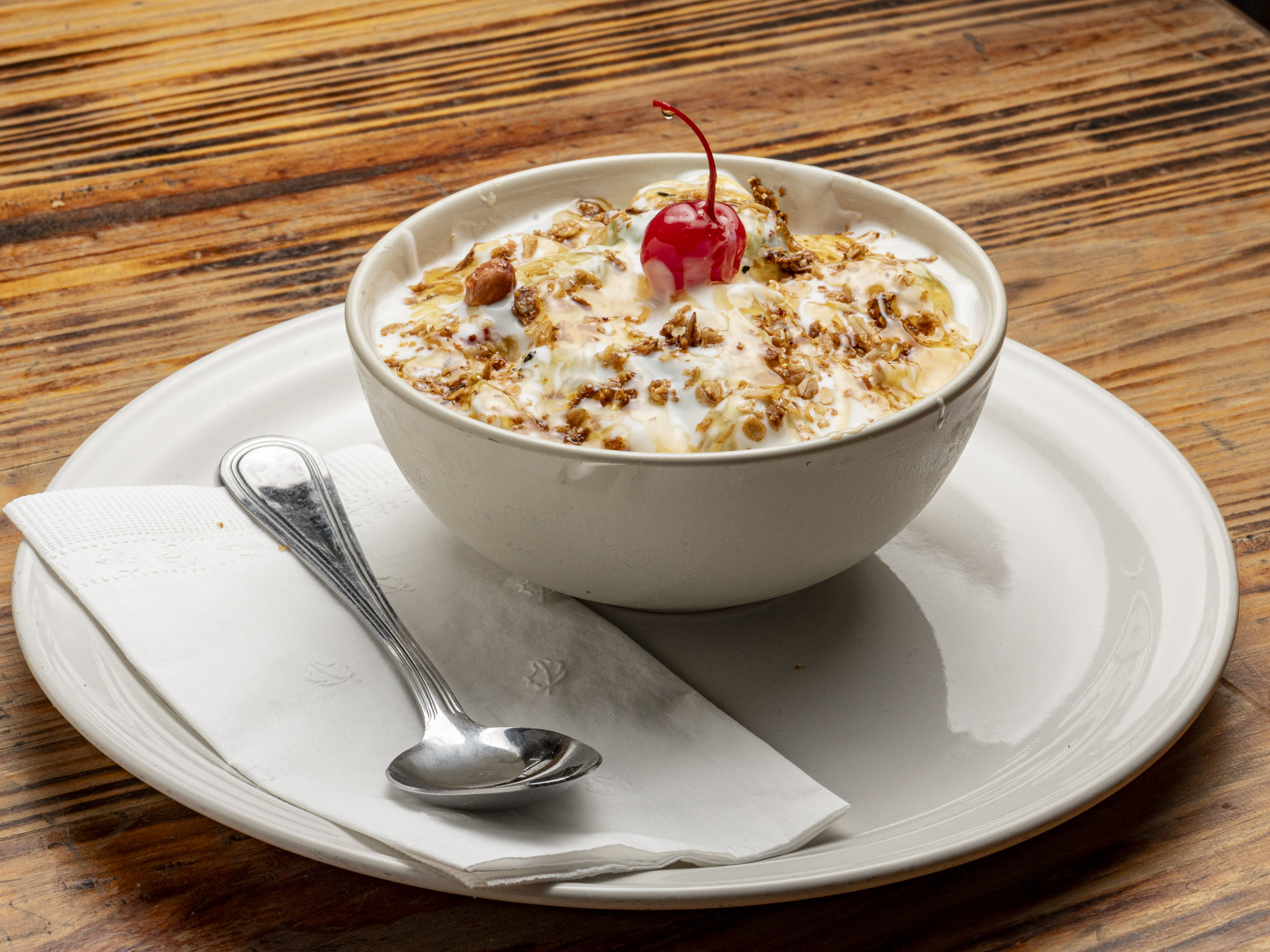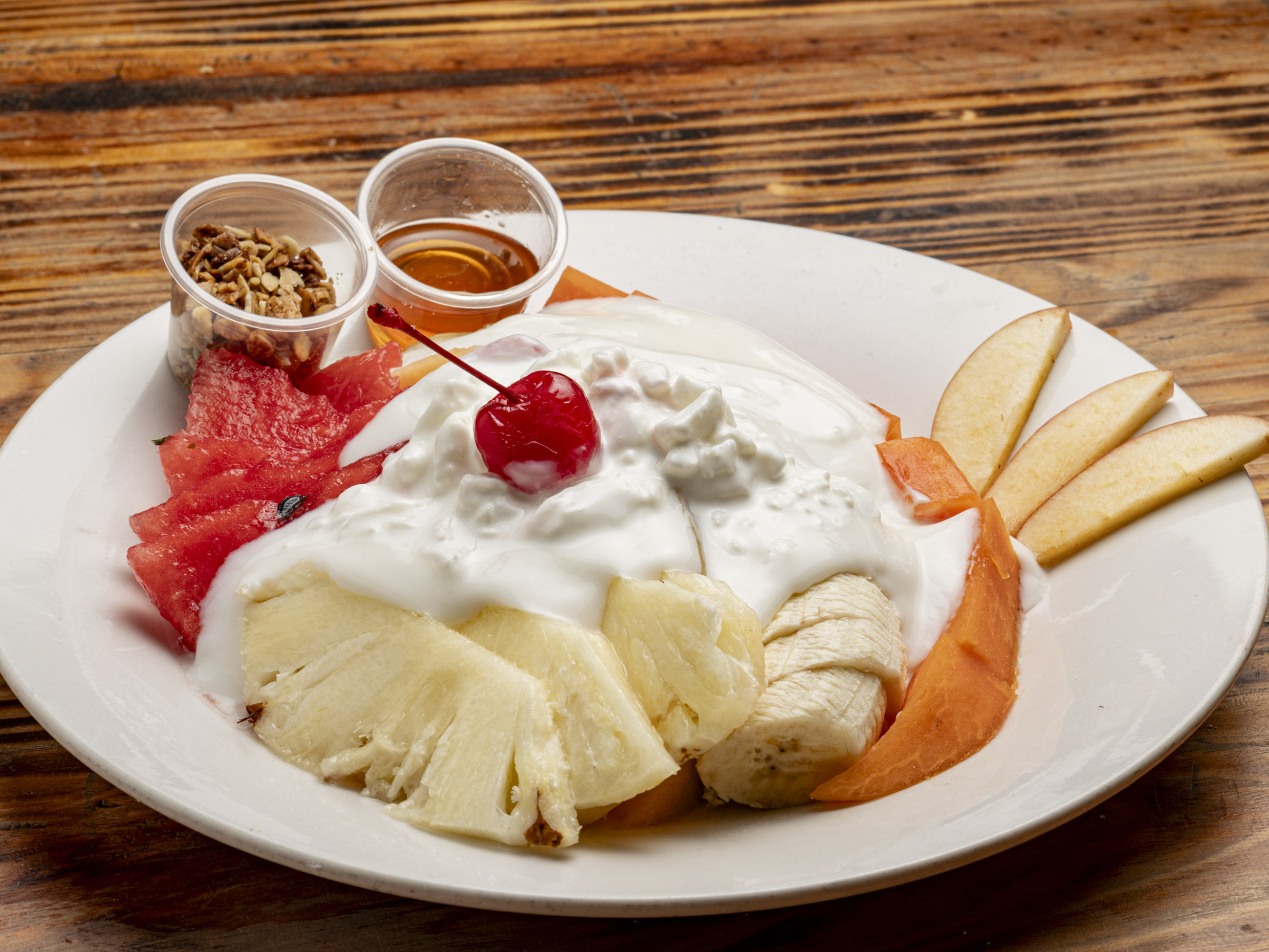 Fruta de temporada (fresa, melón, papaya, plátano y manzana) con yogurt granola y miel.