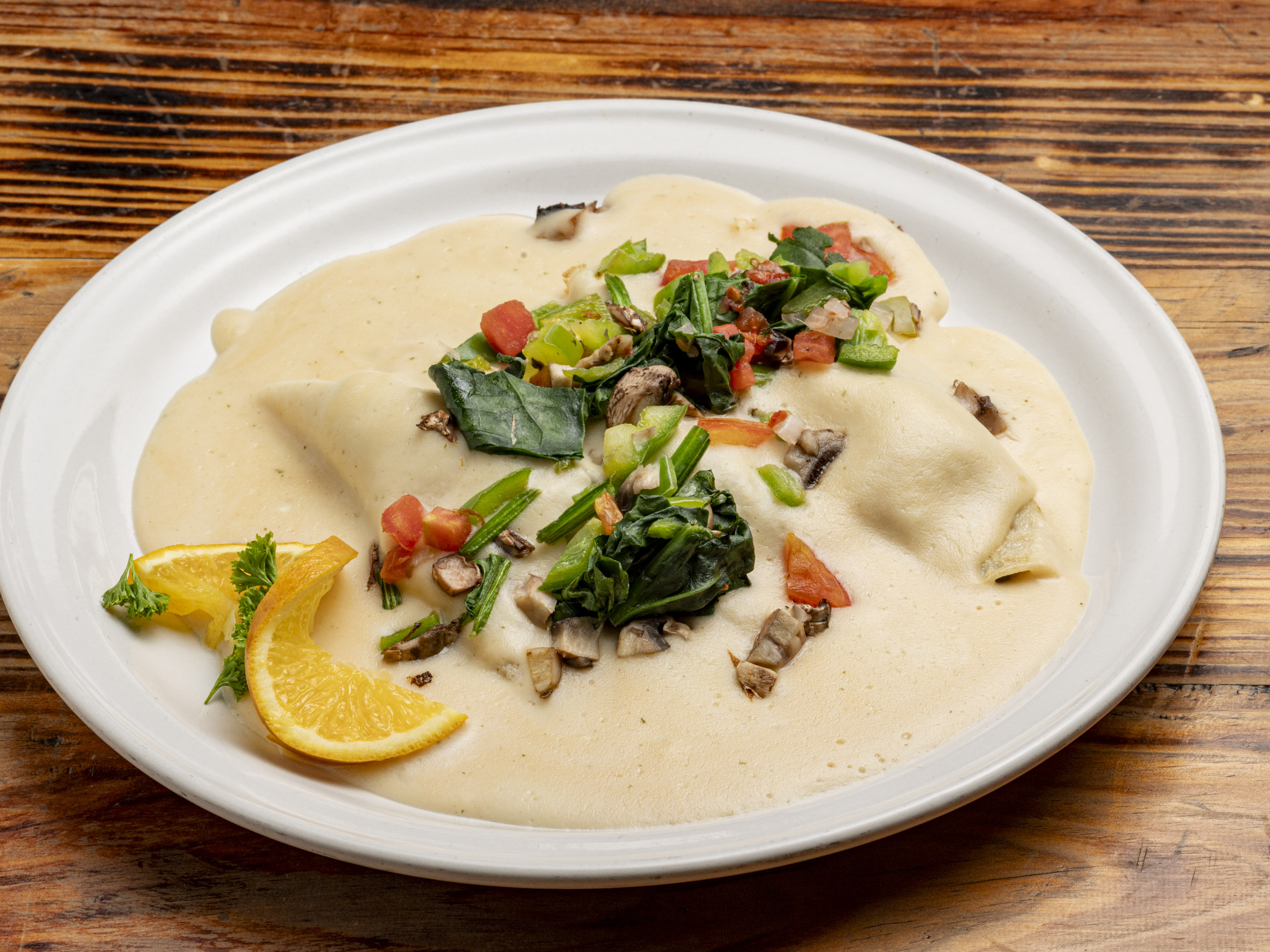 3 pzas De crepas rellenas de verduras guisadas (champiñón, espinaca, morro, jitomate, cebolla).