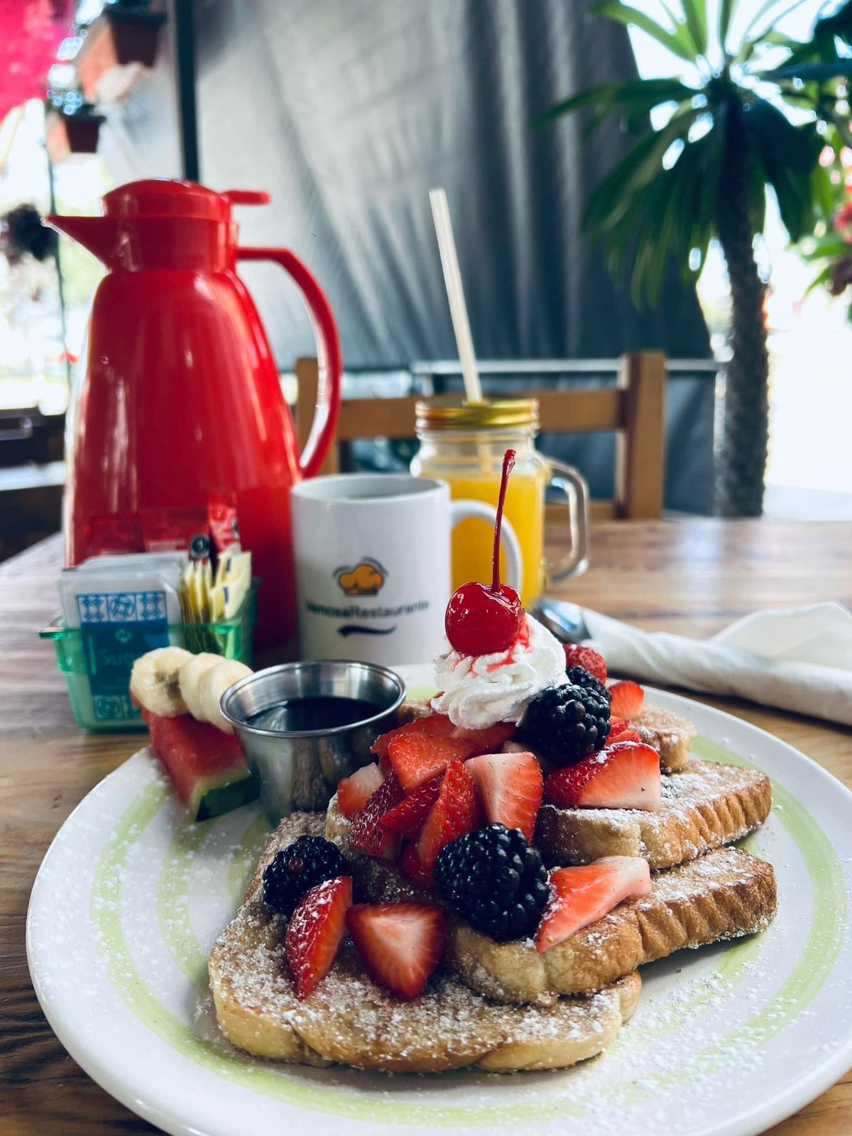 1 pza De waffle con fruta de temporada (fresa, melón, papaya, manzana y plátano) con crema batida cereza y miel maple.