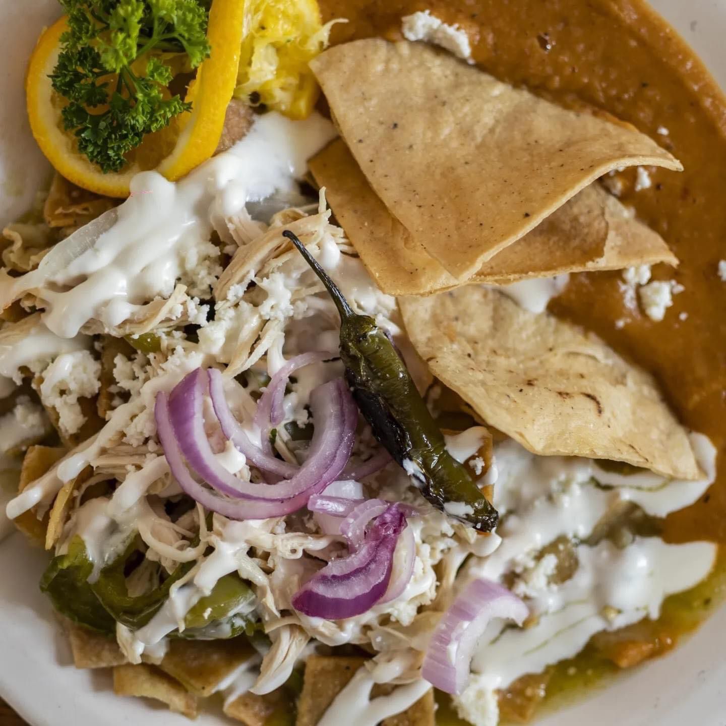 Totopos bañados en salsa de chipotle picosita acompañado de frijoles, crema, queso, cebolla, chile toreado.