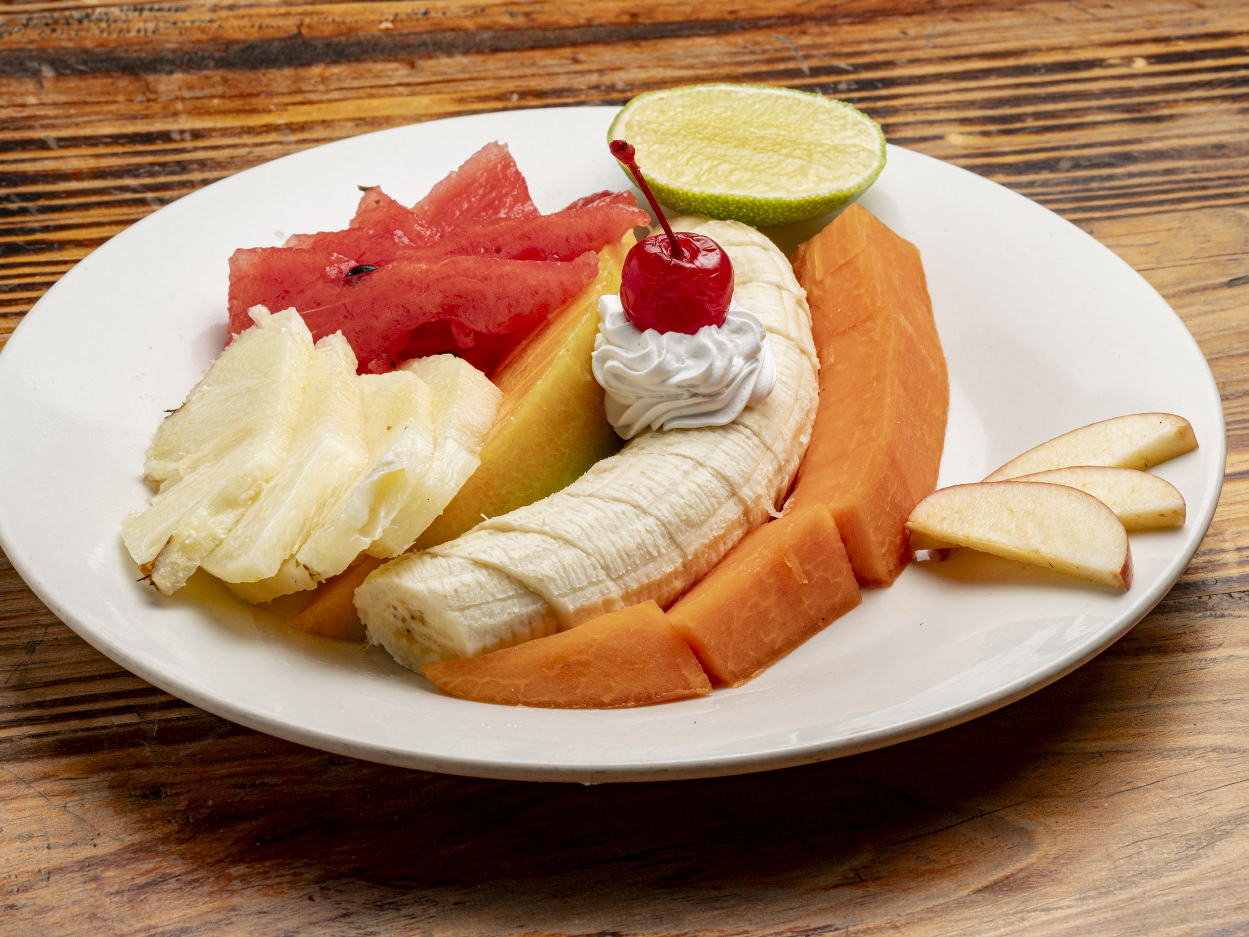 Fruta de temporada (melón, papaya, plátano, piña sandía y manzana) granola y miel.