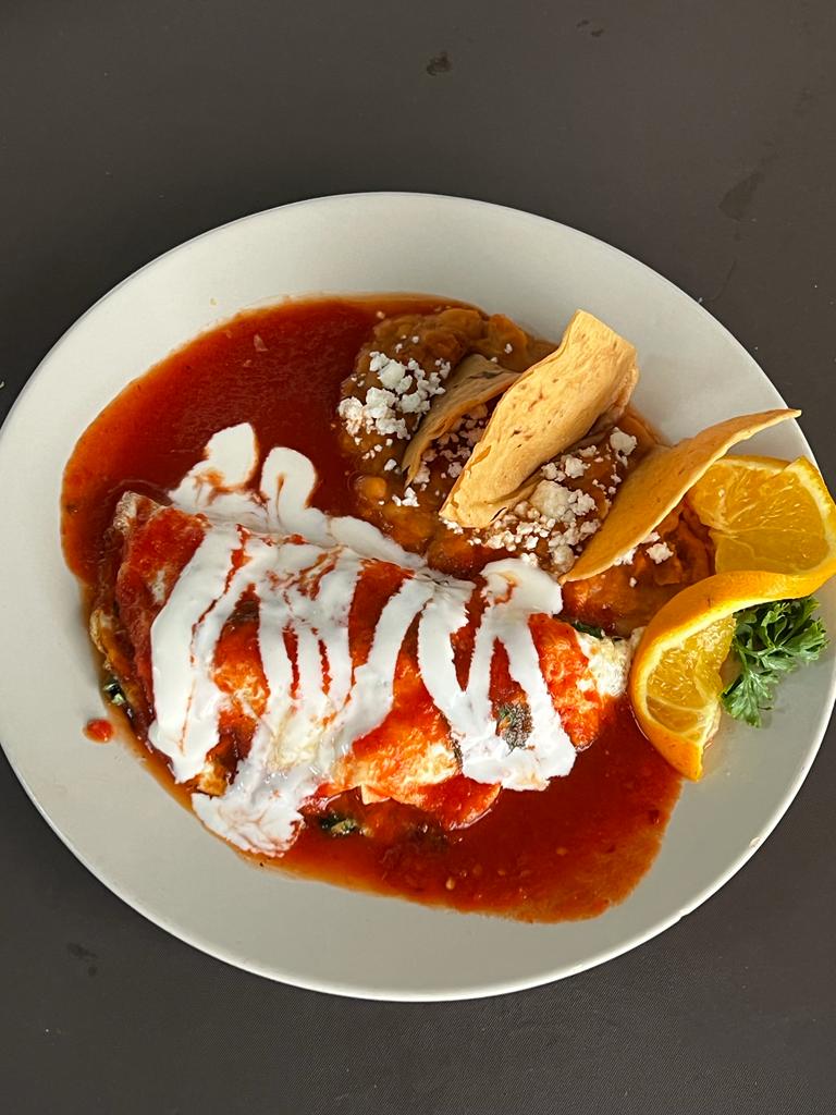 Totopos bañados en salsa roja acompañados de frijoles, crema, queso, cebolla, chile toreado y 1 proteína de tu elección, (platillo personal).