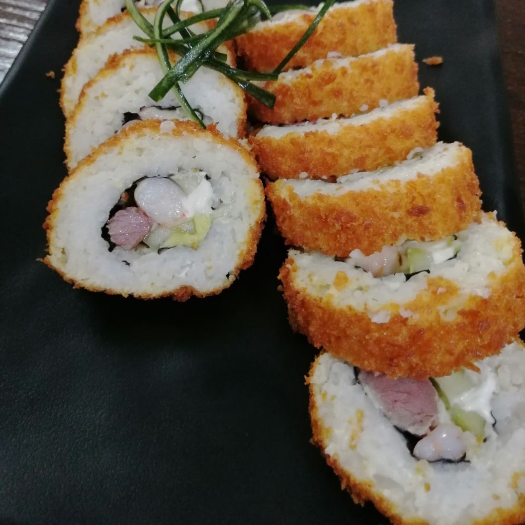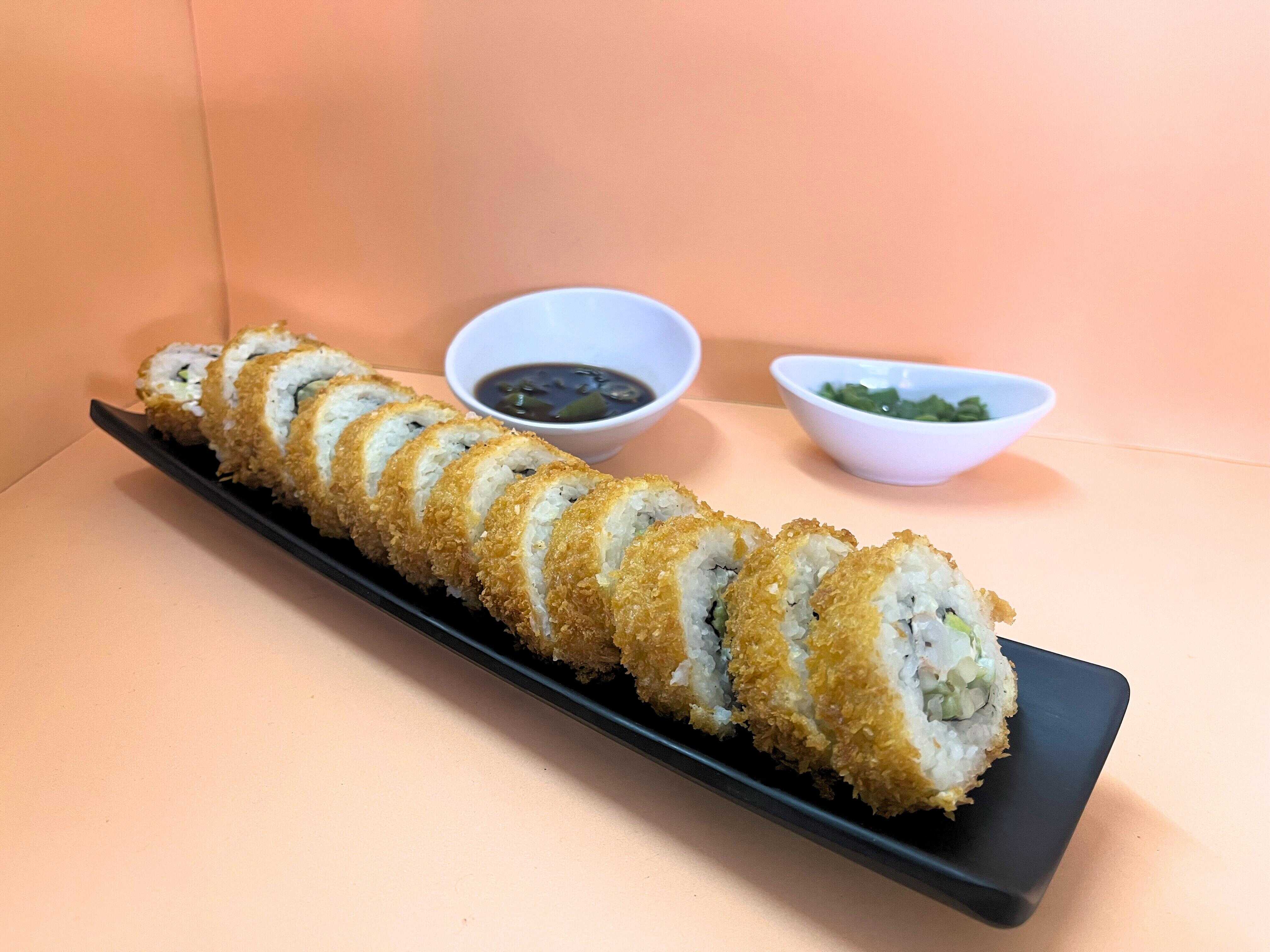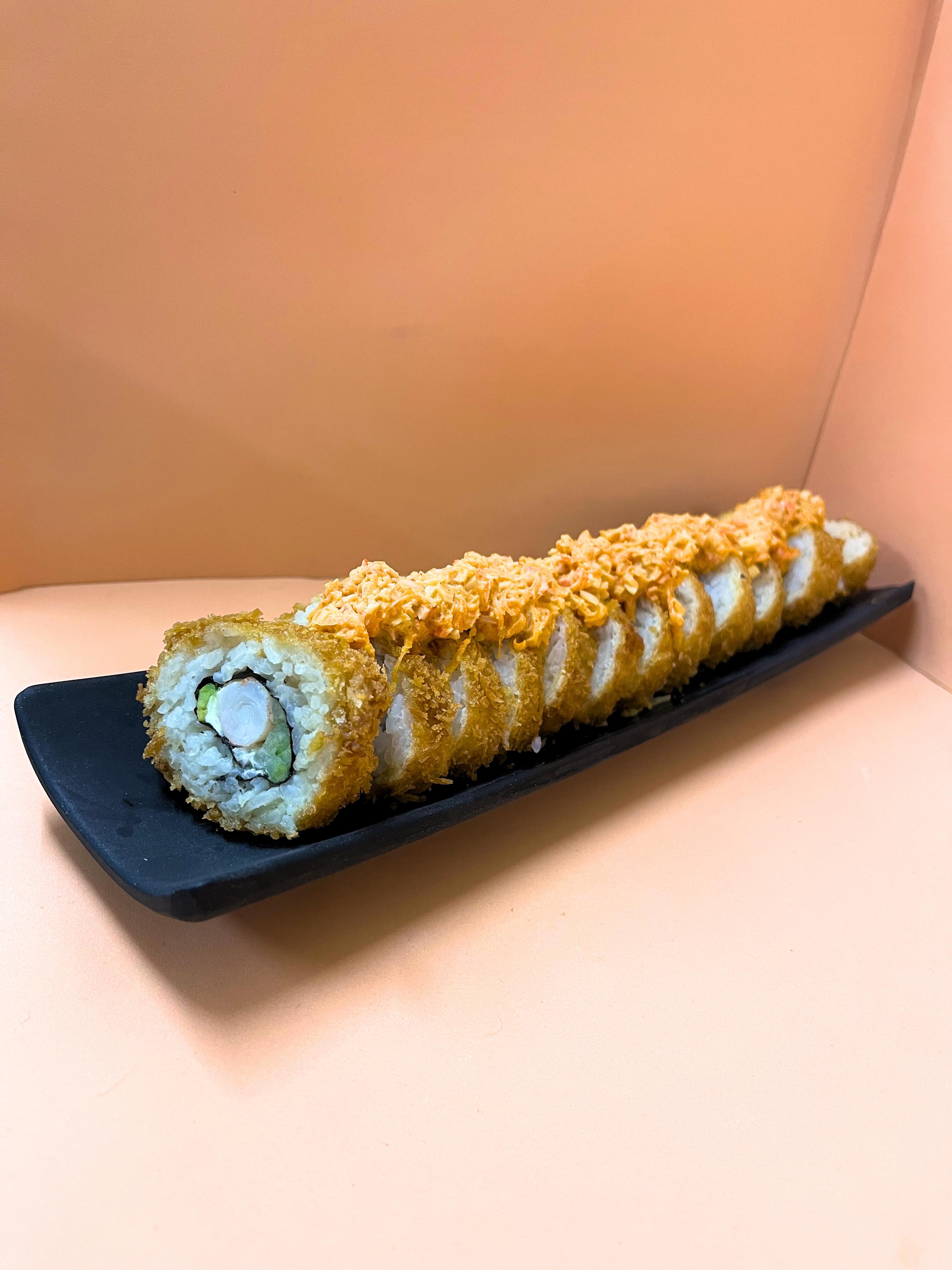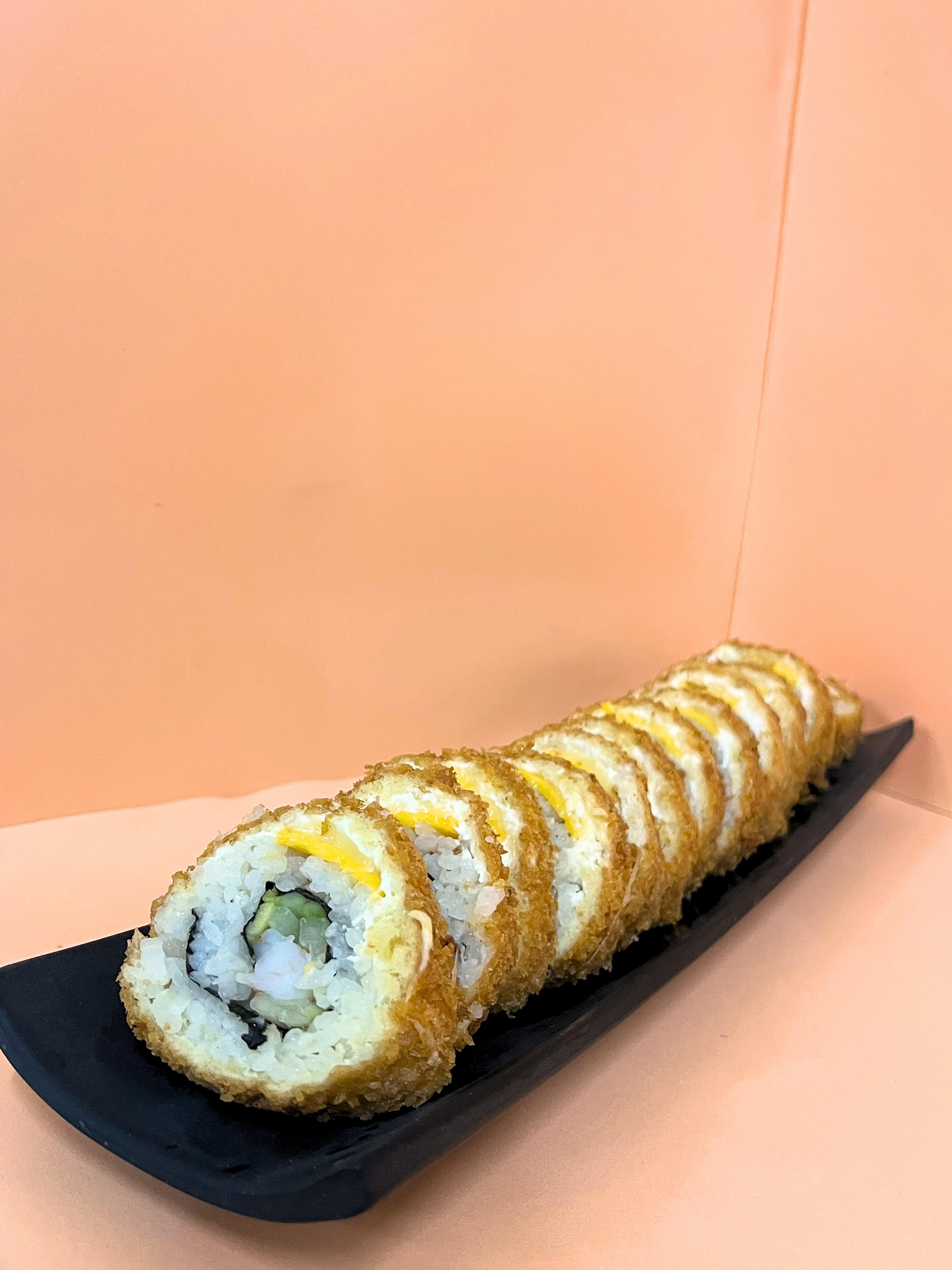 Un rollo que trae de Aprox 10 a 12 piezas de sushi empanizado por fuera, por dentro arroz, pepino, Philadelphia, aguacate y surimi