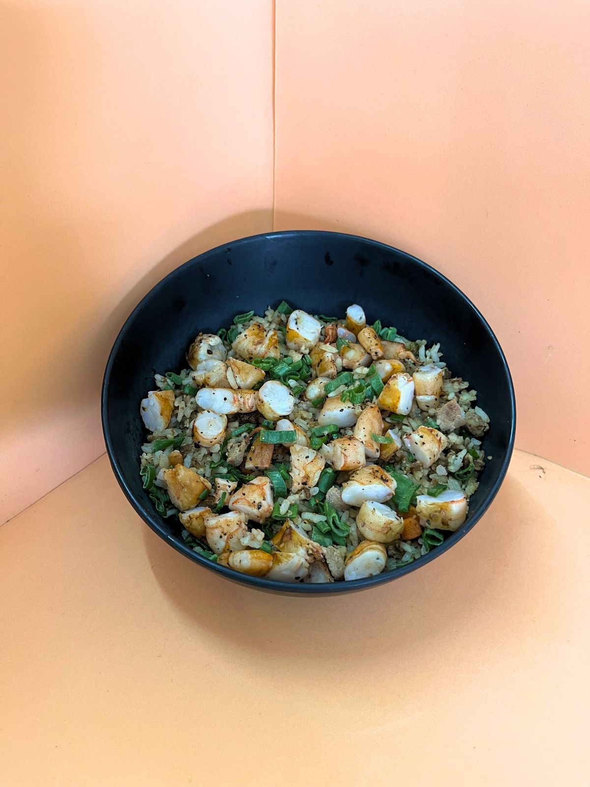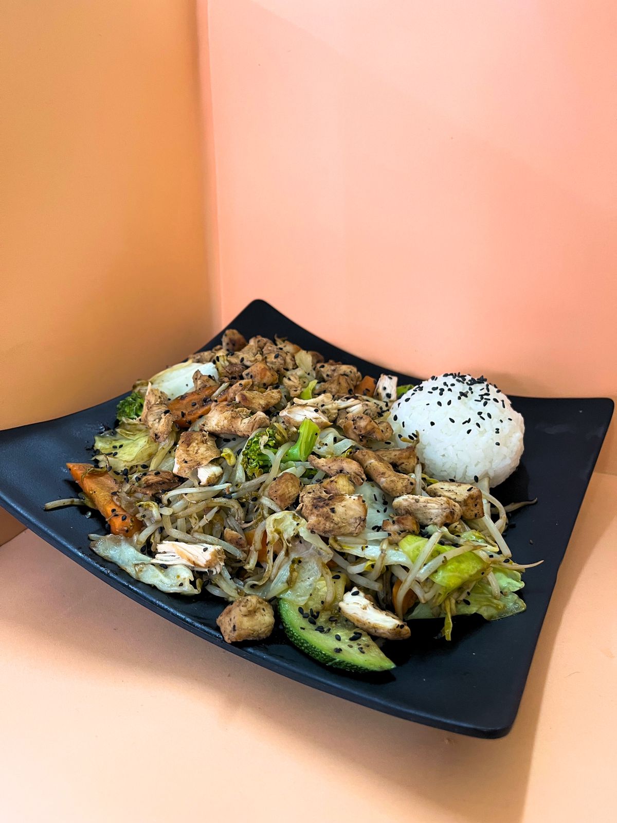 Arroz frito con champiñones manchego Coronado con ensalada de surimi aguacate Philadelphia y ajonjolí