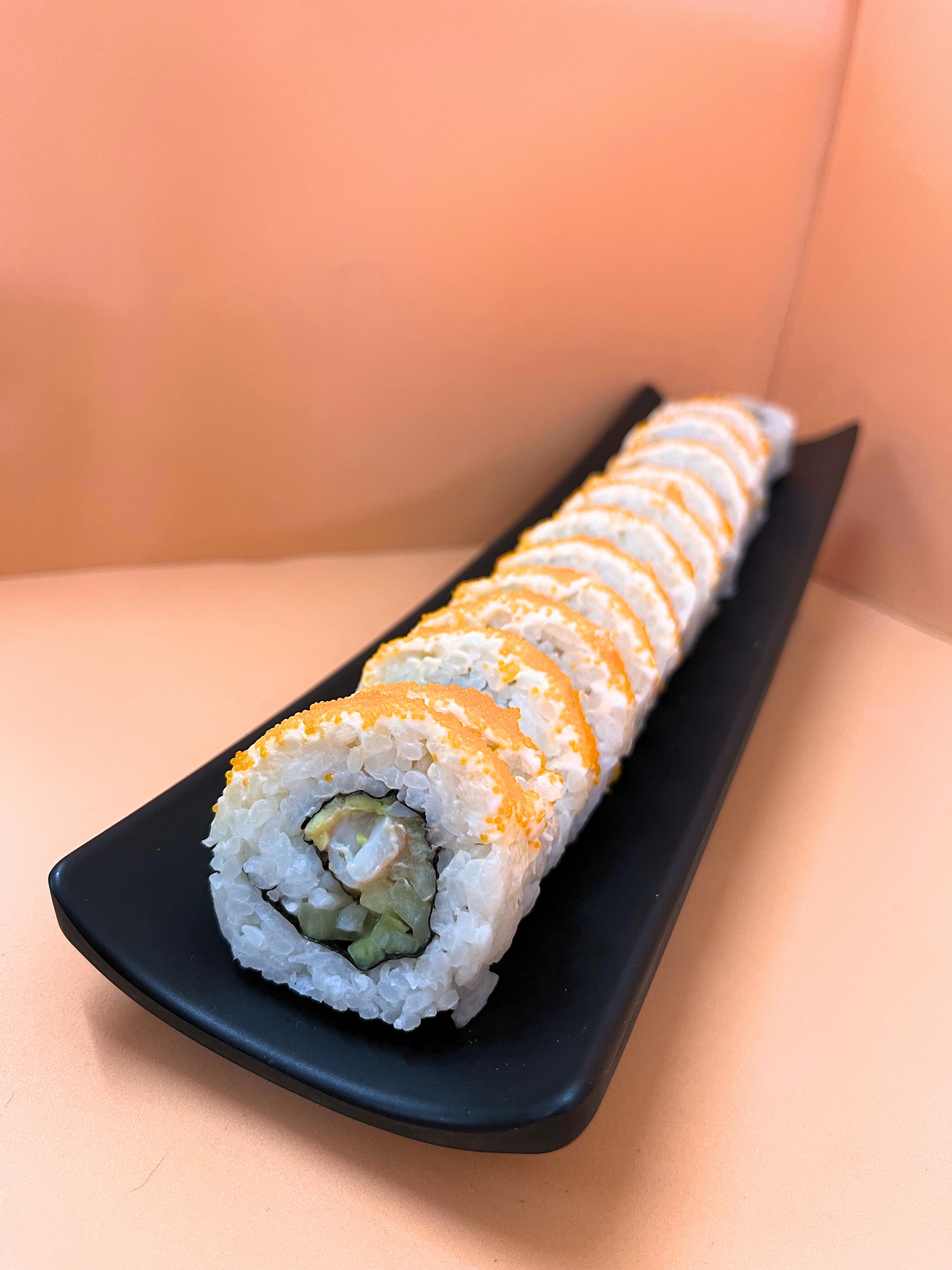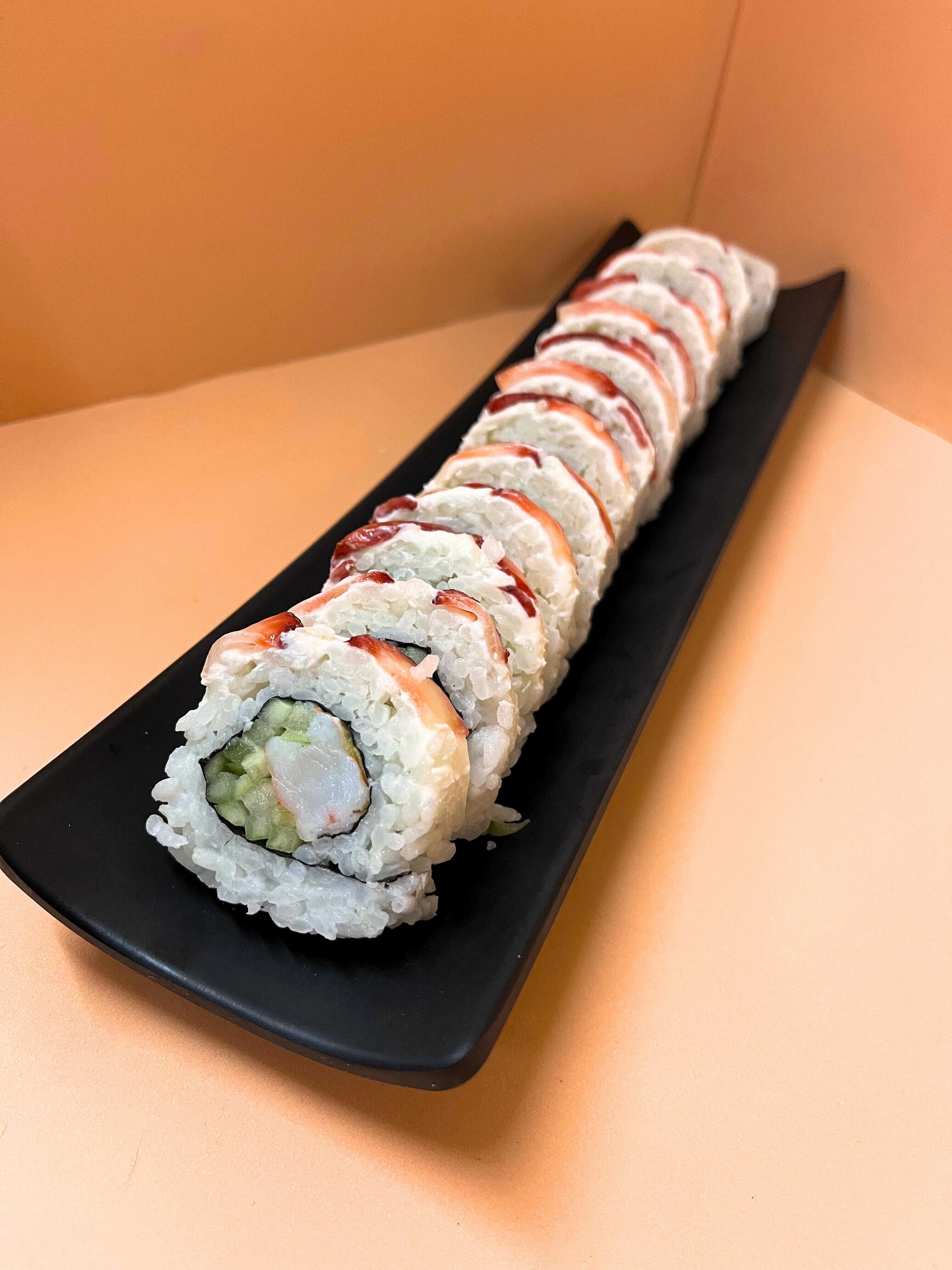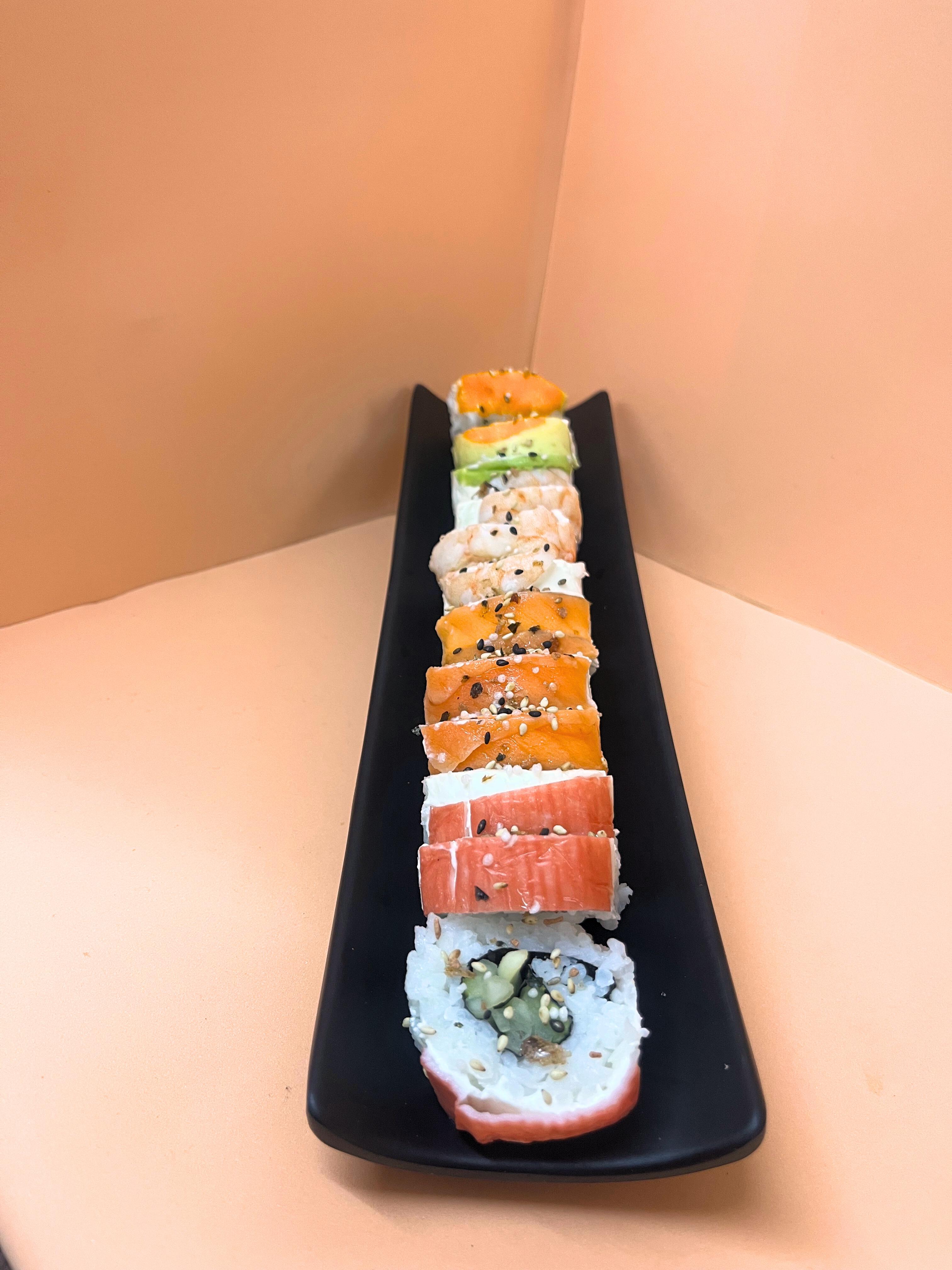 Un rollo que trae de Aprox 10 a 12 piezas de sushi Relleno con camarón, por fuera philadelphia, salmón, Masago, surimi y aguacate
