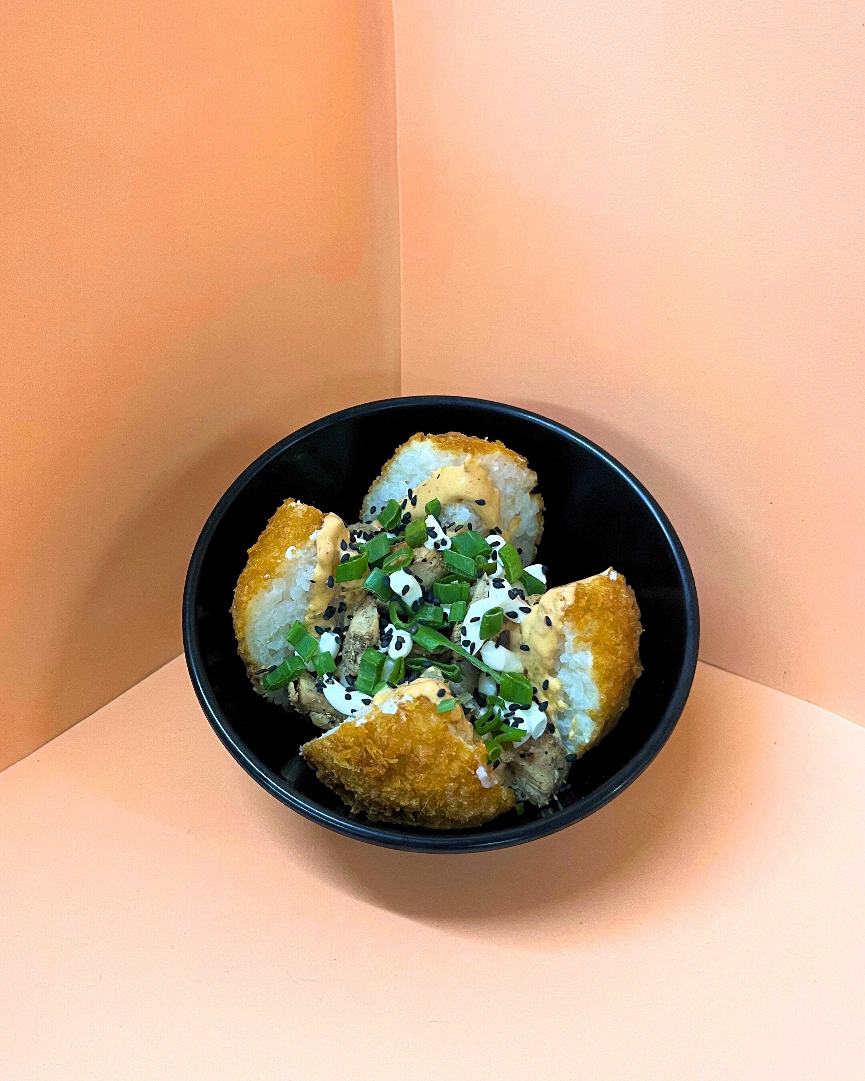 Deliciosa bolita de arroz empanizada coronada con Philadelphia Chipotle pollo y ajonjoli