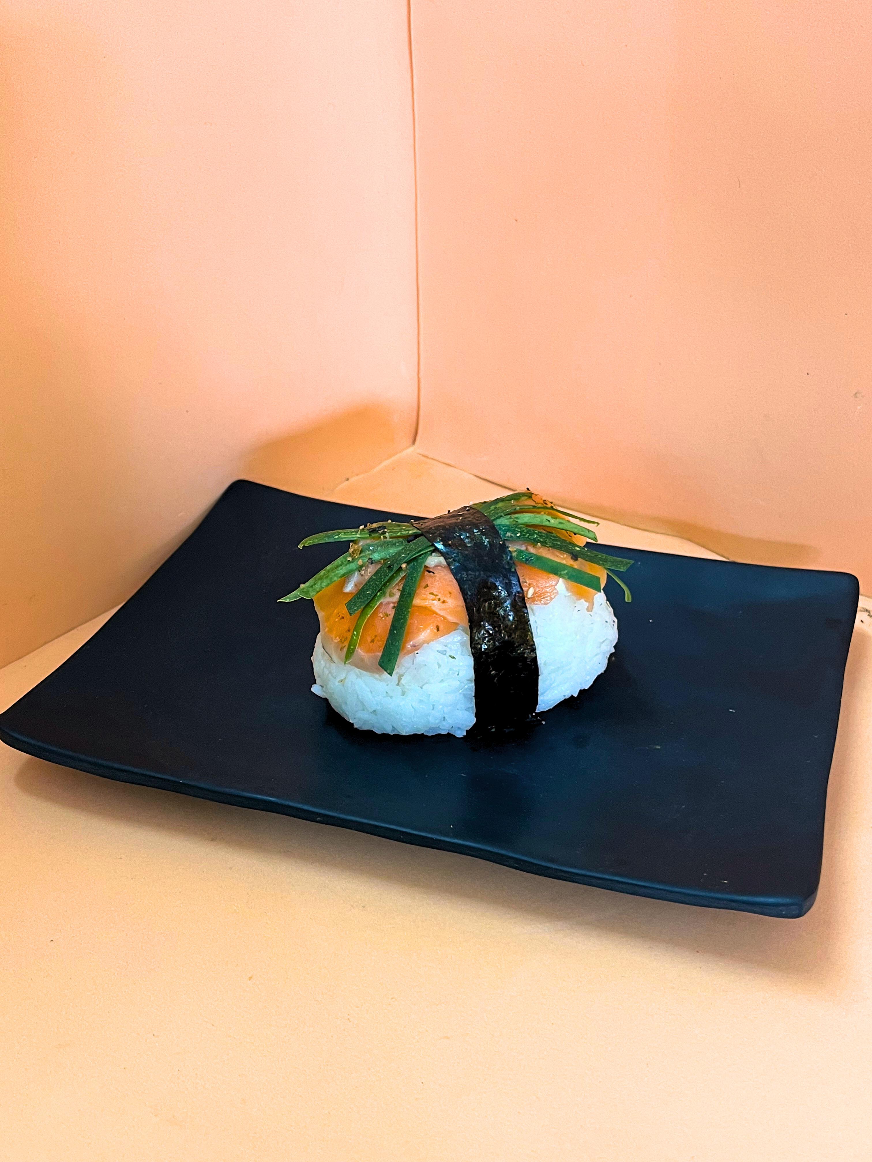 Un rollo que trae de aprox 10 a 12 piezas de sushi por fuera delicioso salmón fresco con philadelphia, espolvoreado con furikake por dentro pepino y aguacate.