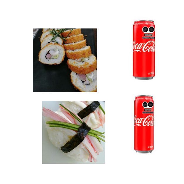Sushi philadelphia empanizado, nigiri, una coca cola.