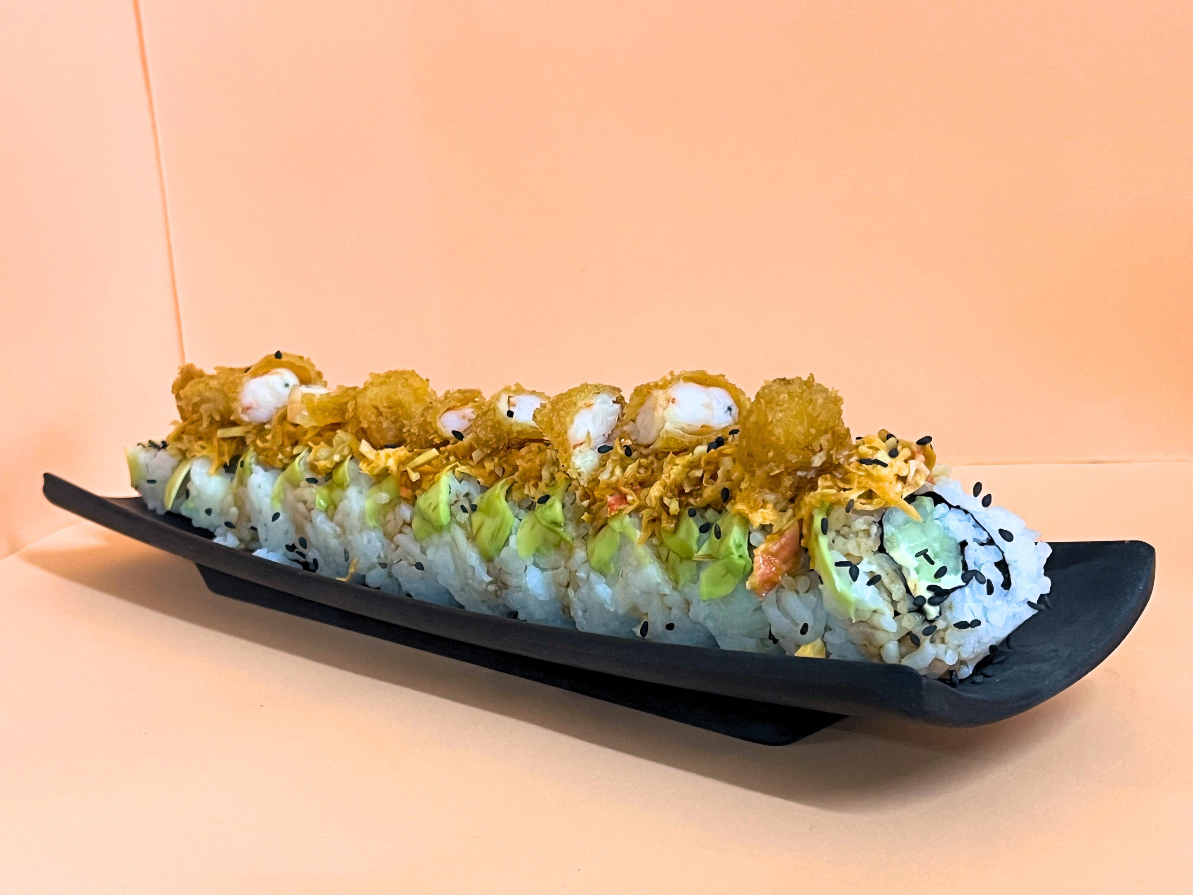 Un rollo que trae de Aprox 10 a 12 piezas de sushi Por fuera empanizado con Panko, por dentro camarón, coronado con ensalada spicy