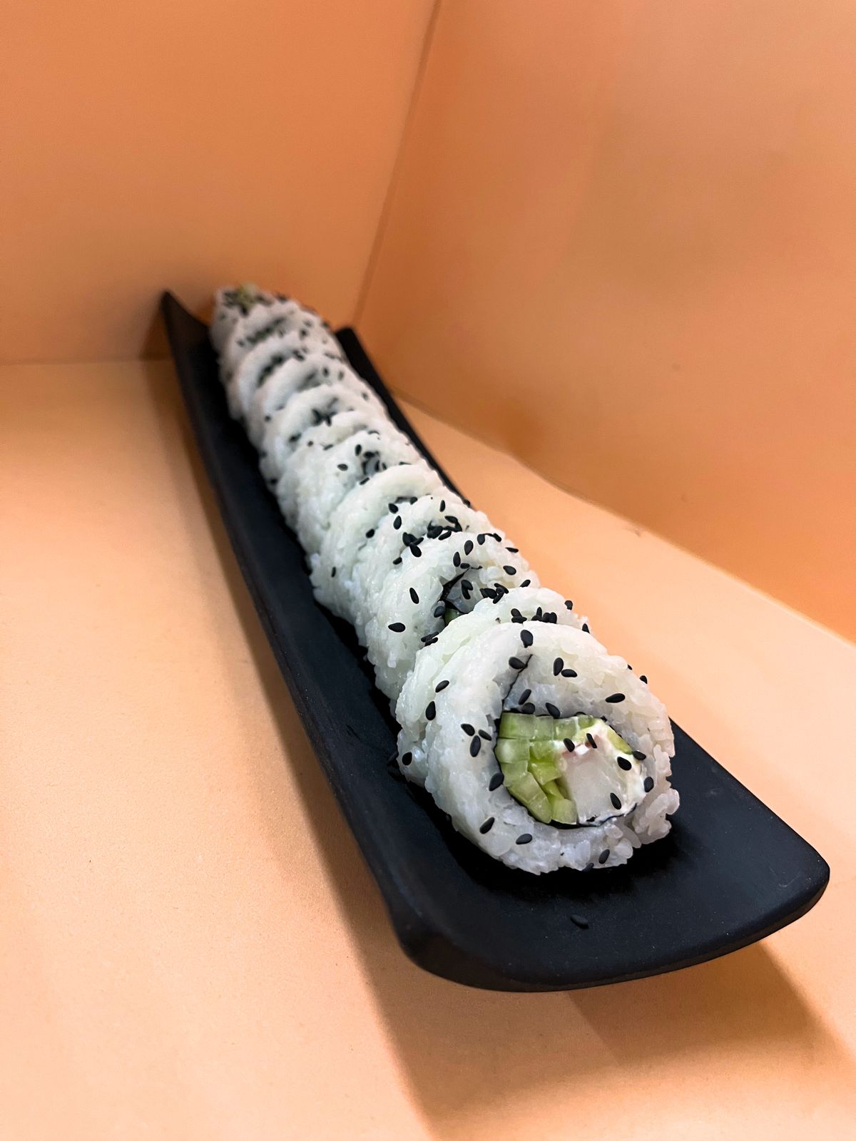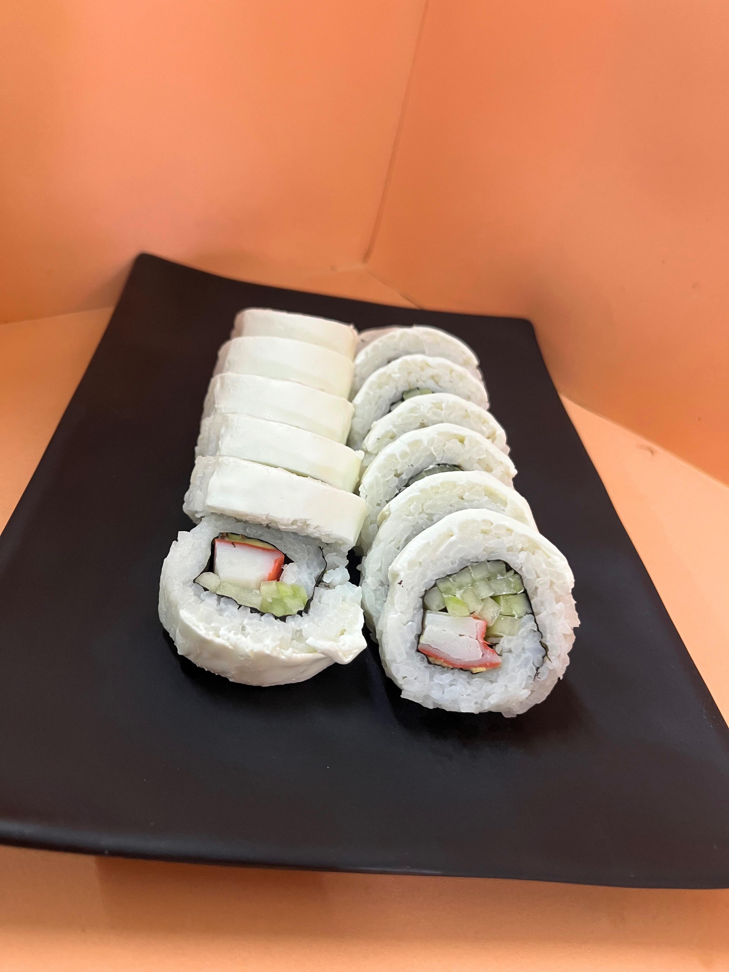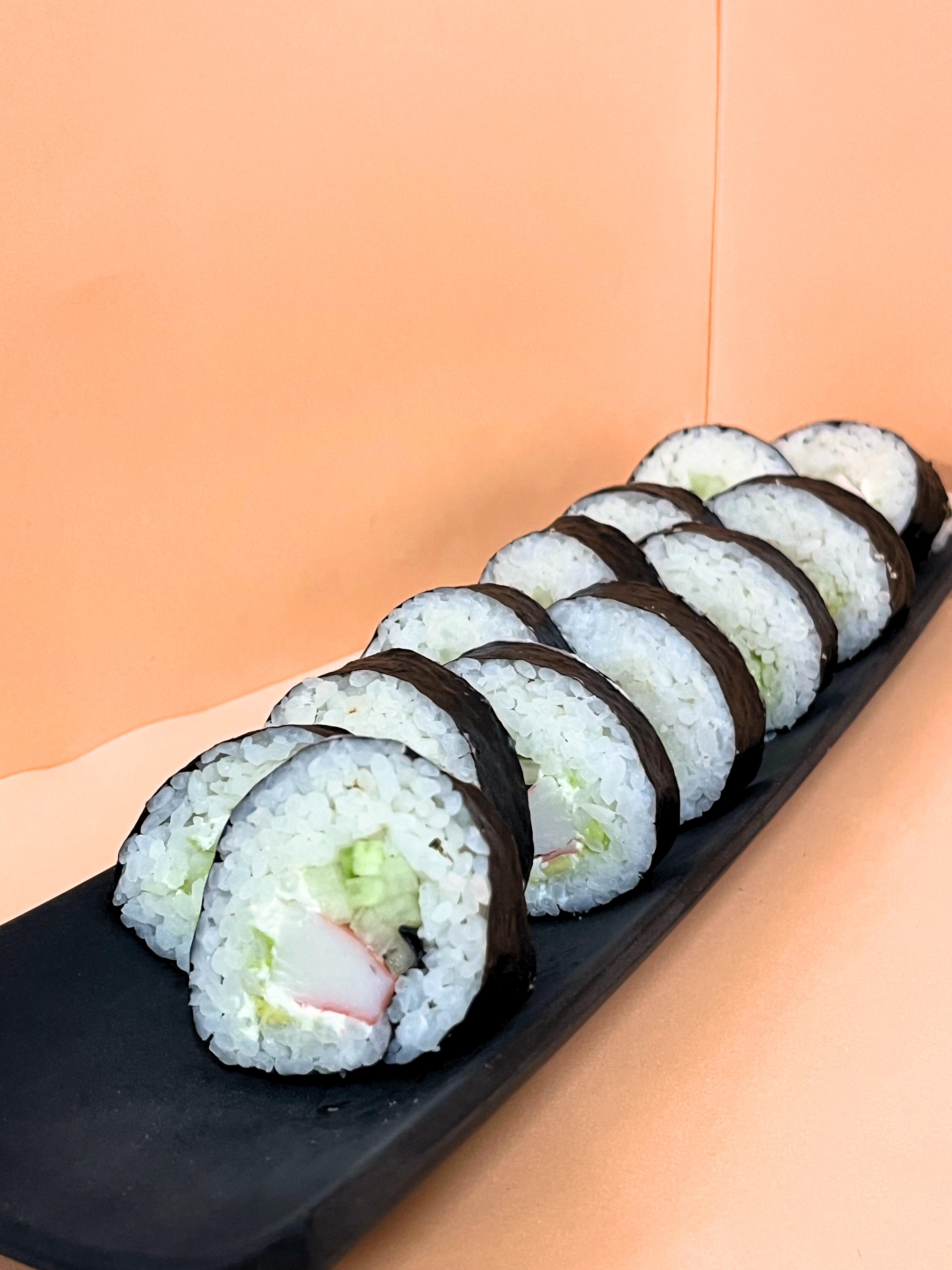 Un rollo que trae de Aprox 10 a 12 piezas de sushi Arroz por fuera, por dentro alga, pepino, Philadelphia, aguacate y surimi