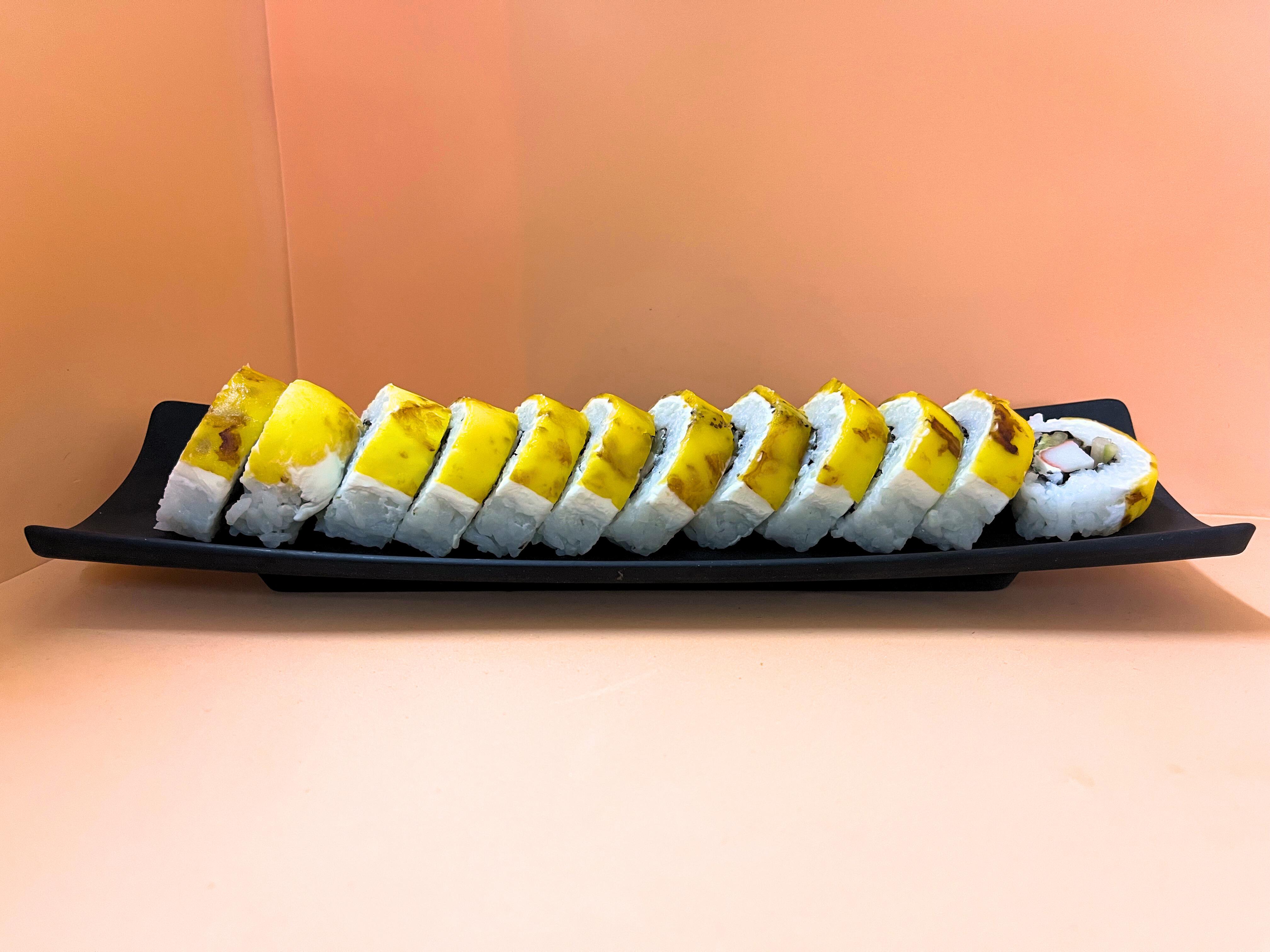 Un rollo que trae de Aprox 10 a 12 piezas de sushi de Platano macho por fuera, por dentro arroz, pepino, Philadelphia, aguacate y surimi