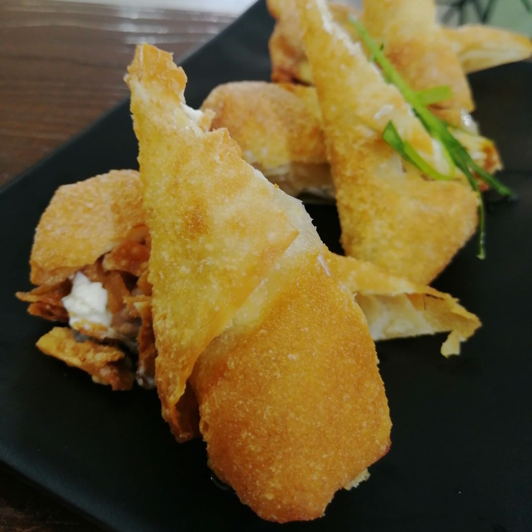 Rollito de masa frita rellena de pollo y philadelphia.