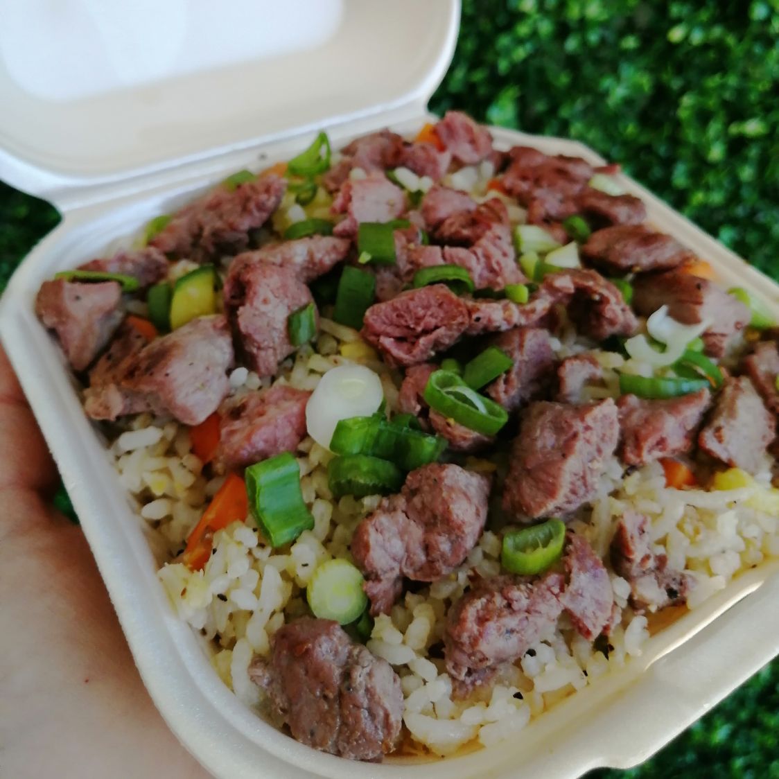 Verduras a la plancha con proteína acompañado de gohan.
