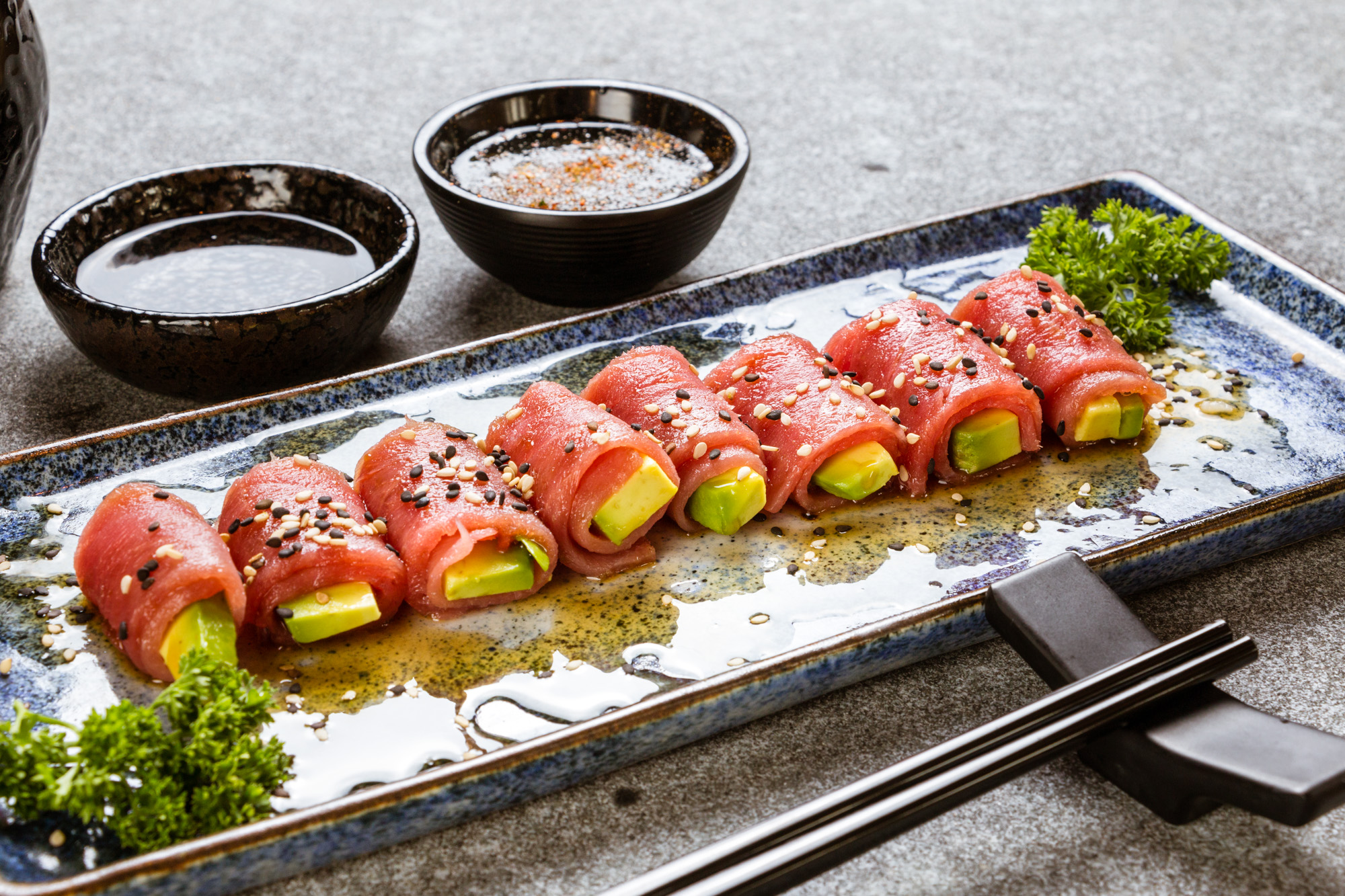 Relleno de camarón y queso crema, cubierto de aguacate, topping tartare de atún con mayonesa de wasabi.