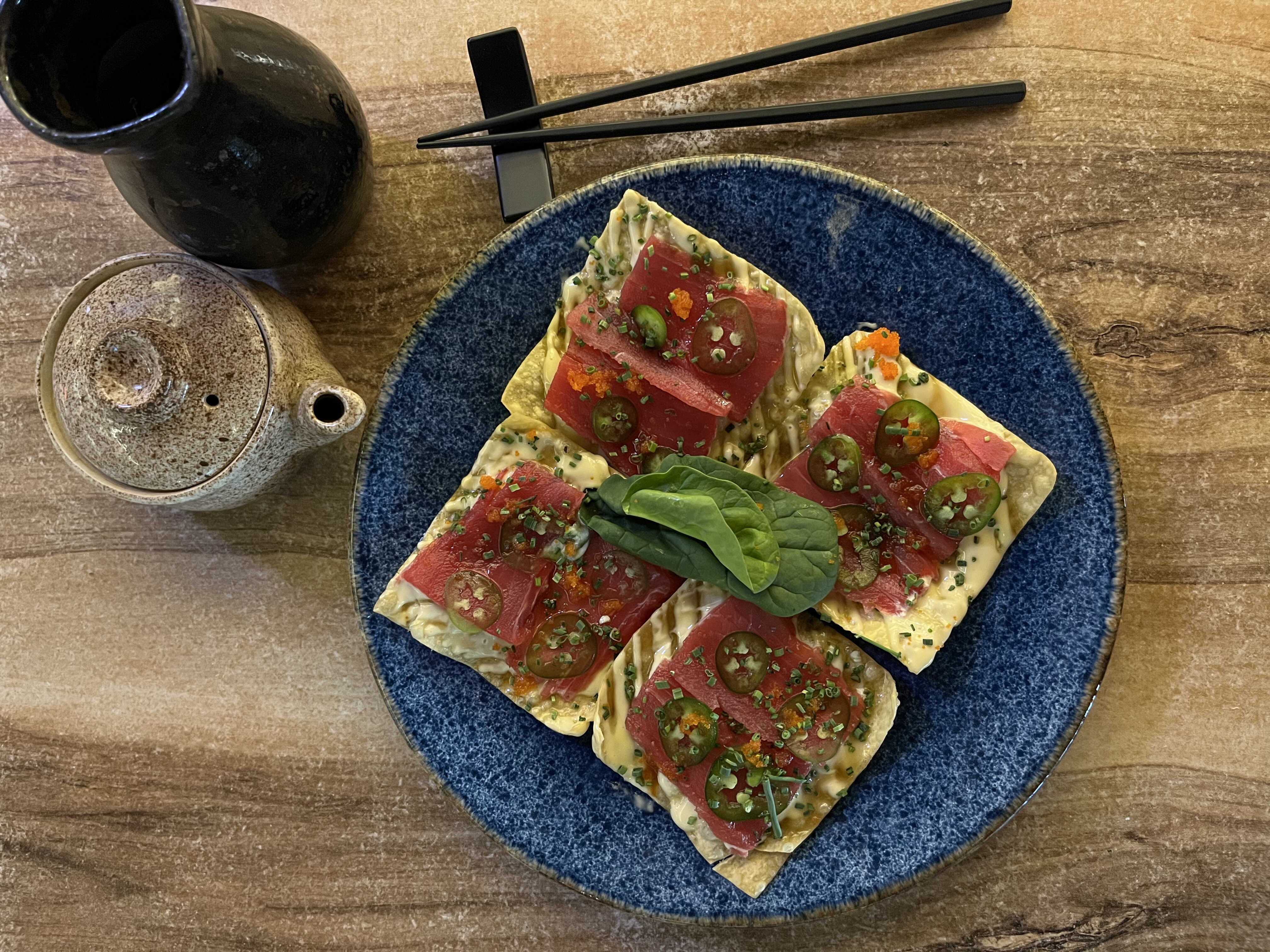 Tostadita de wonton bañada en mayonesa de la casa y salsa tipo yuzu, con finos cortes de atún, rodajas de jalapeño y masago. ¡Una delicia!