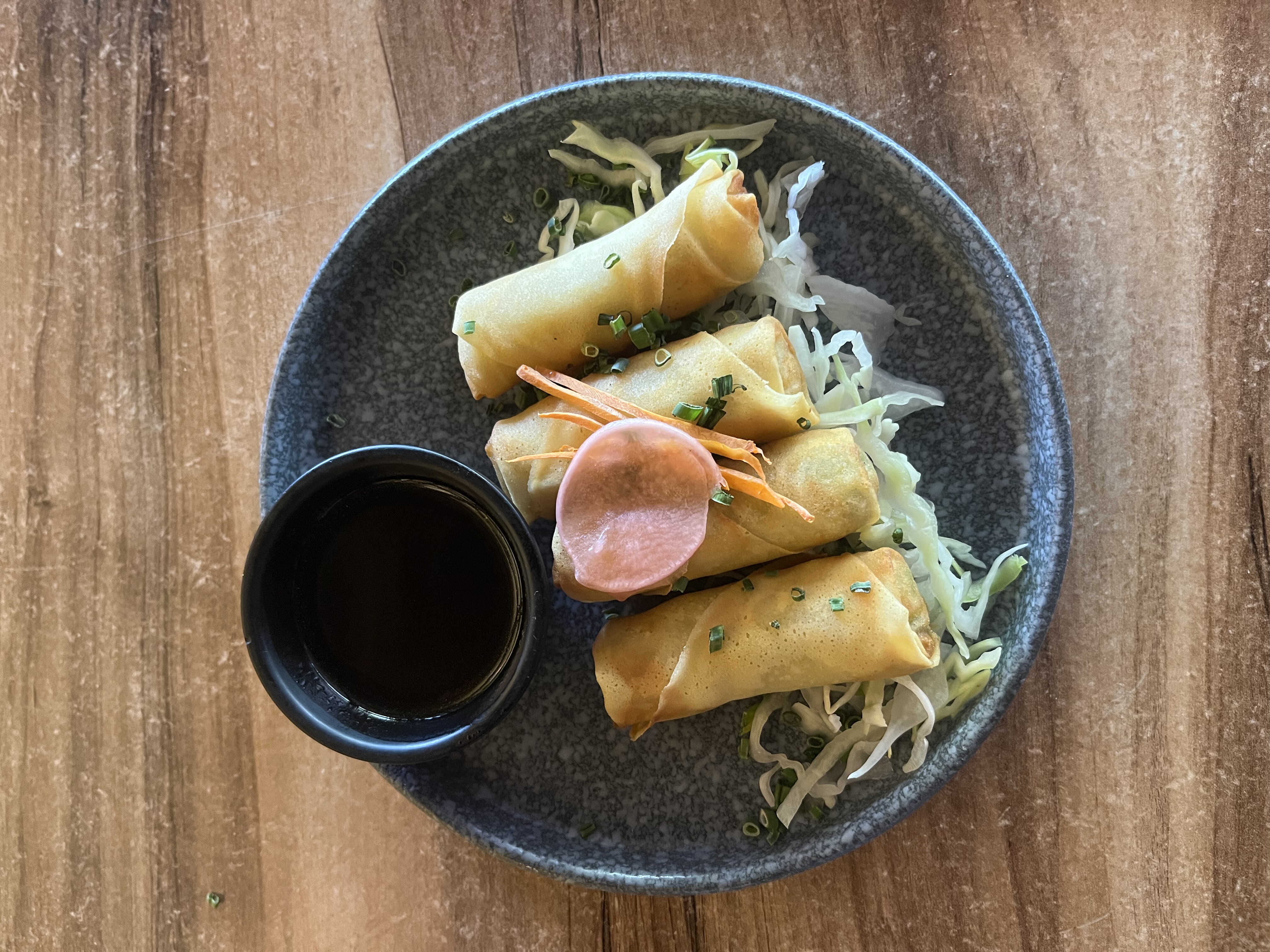 Rollito primavera de verduras, acompañado de salsa oriental.