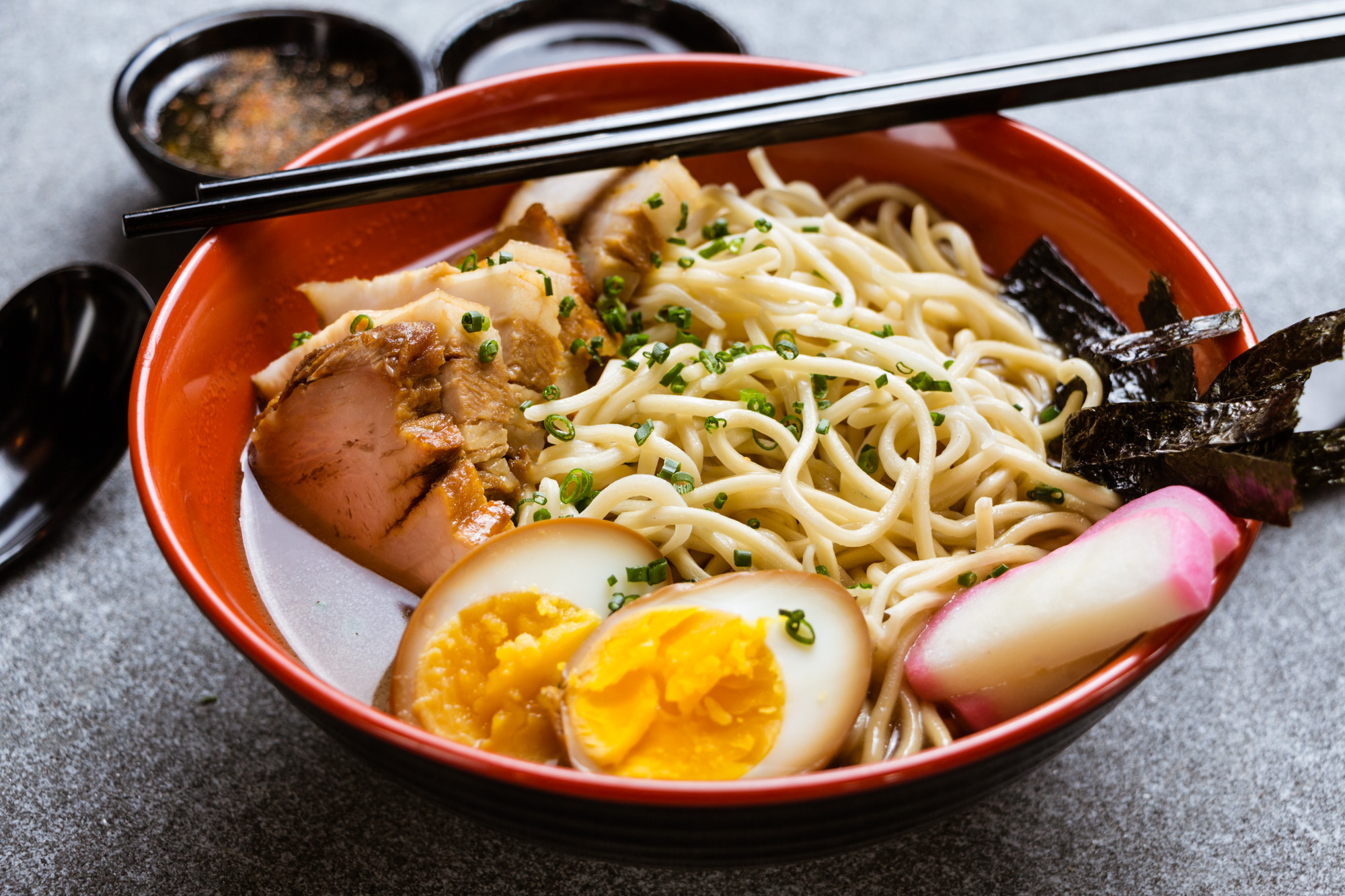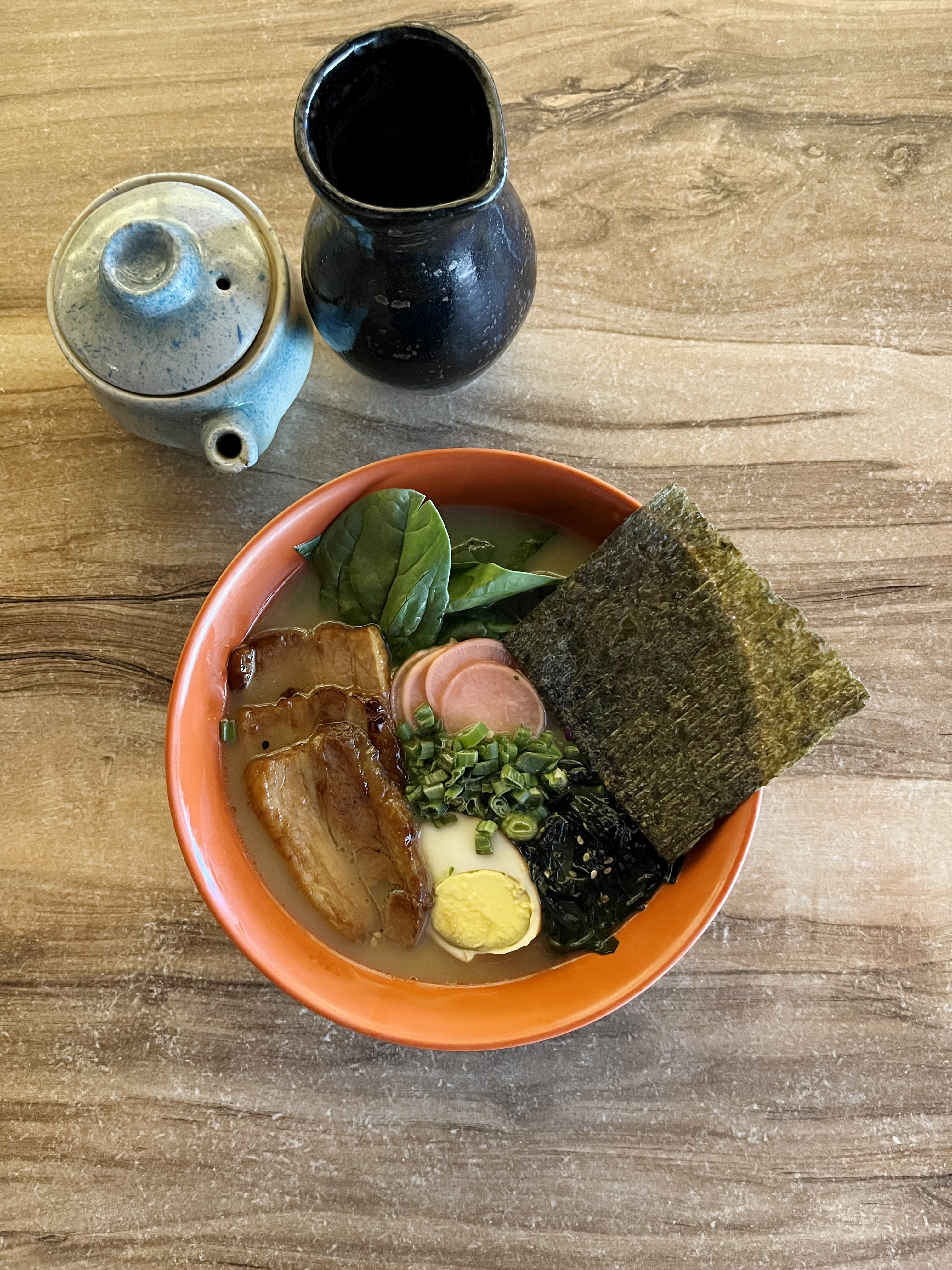 Cerdo chashu 100 g, base de dashi y miso noodle, espinaca blanqueada, wakame, huevo y togarashi, aromatizado con aceite de cebolleta.