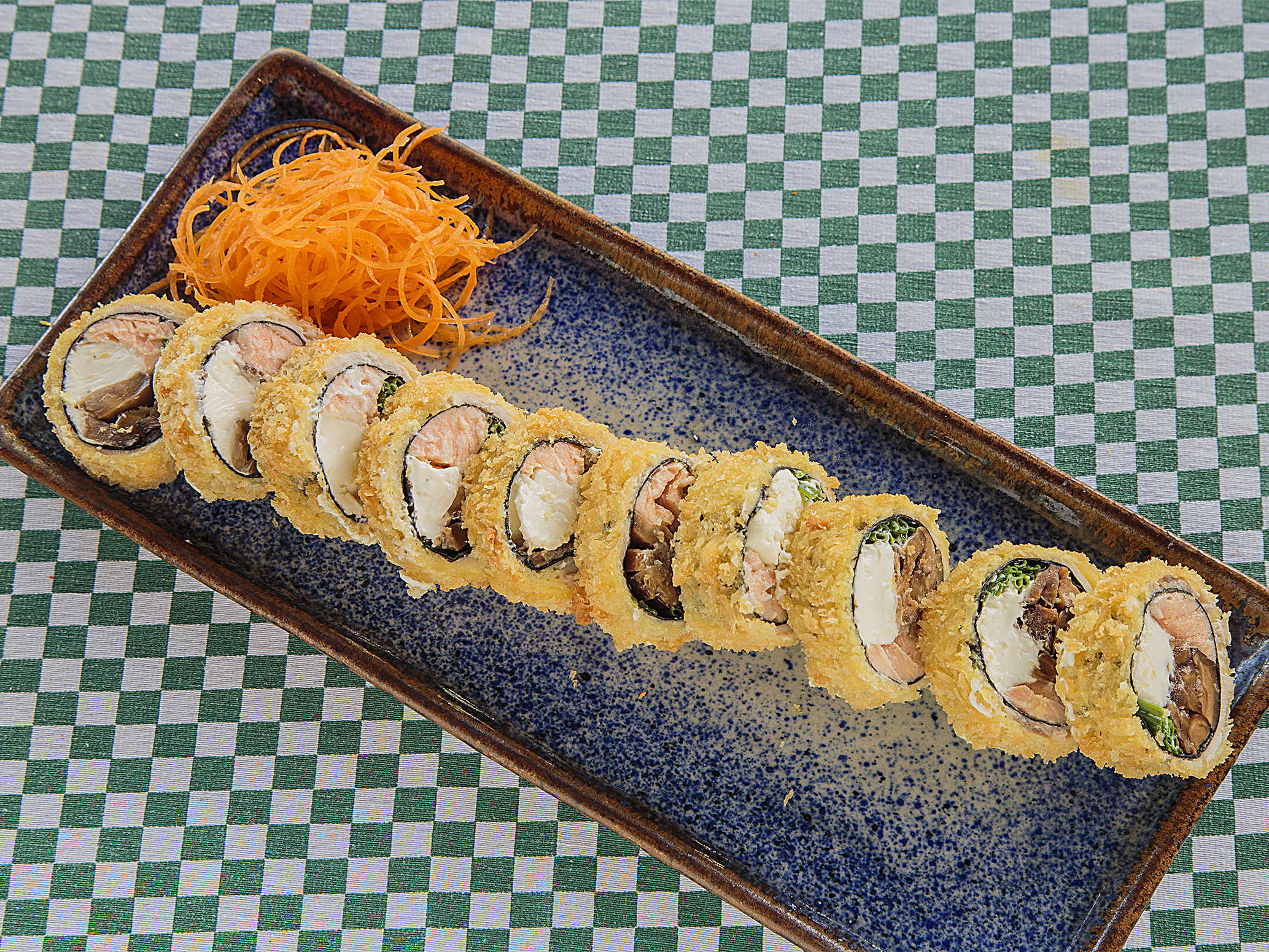 Relleno: mousse de kani, ebi furai, cubierta: atún, aguacate, bañado: Mayonesa ponzu, masago, cebollín.