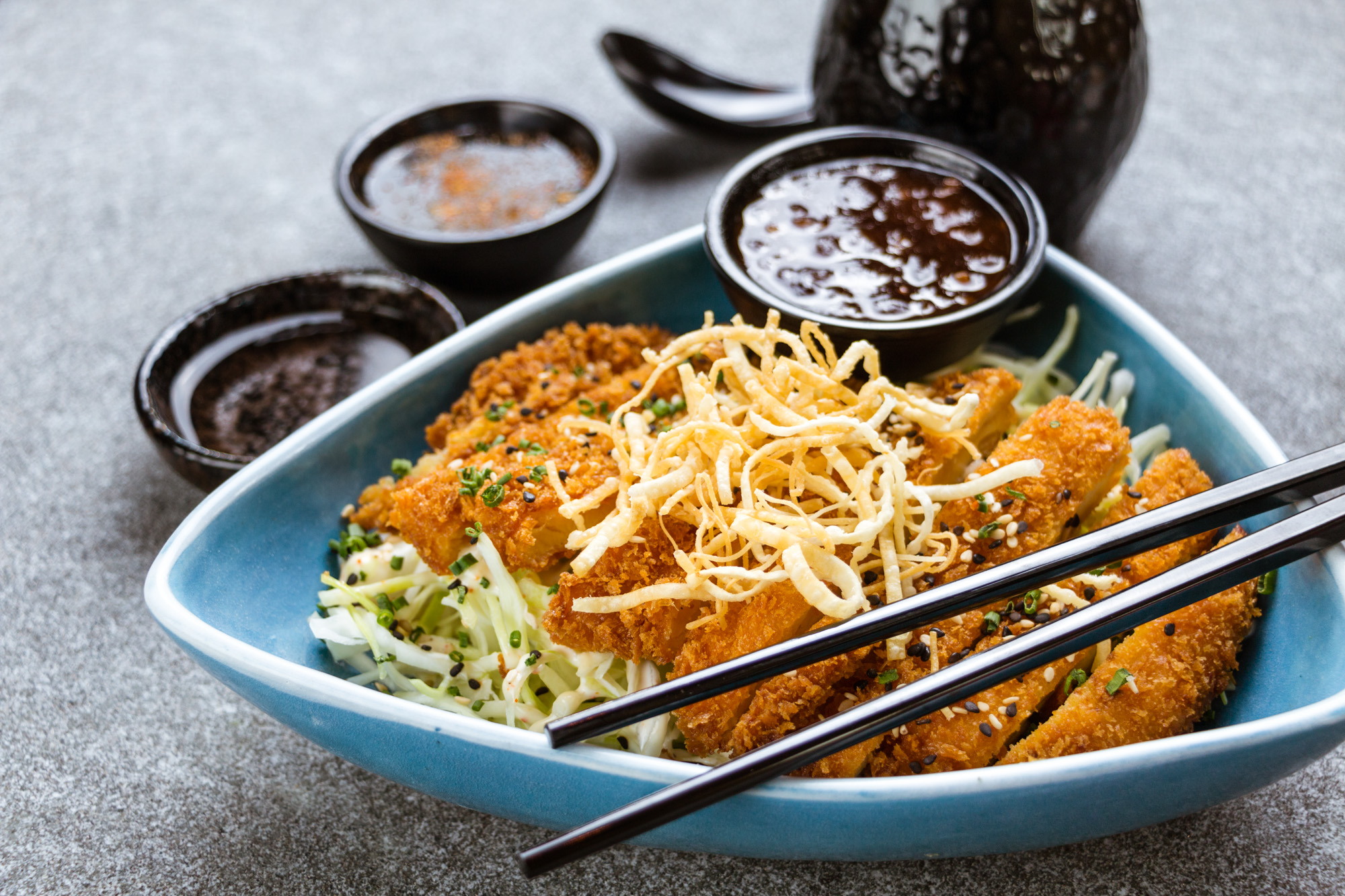150 g, De pechuga de pollo al panko 150 g, col, gohan, salsa tonkatsu.