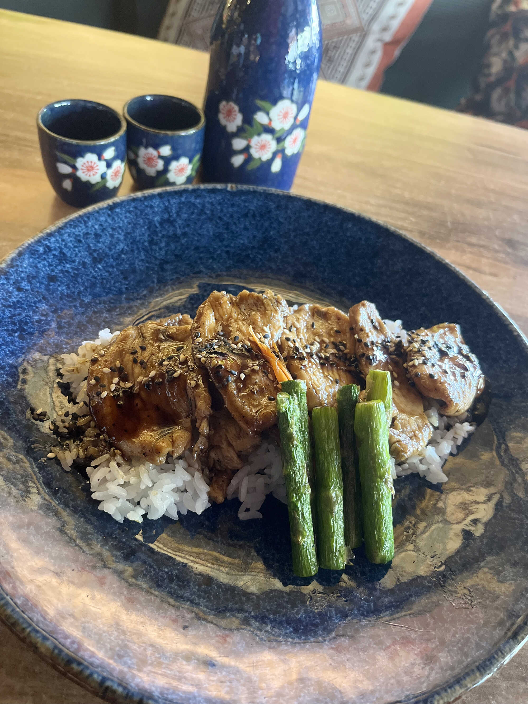 Pollo estilo teriyaki, acompañada de arroz gohan y espárrago frito.