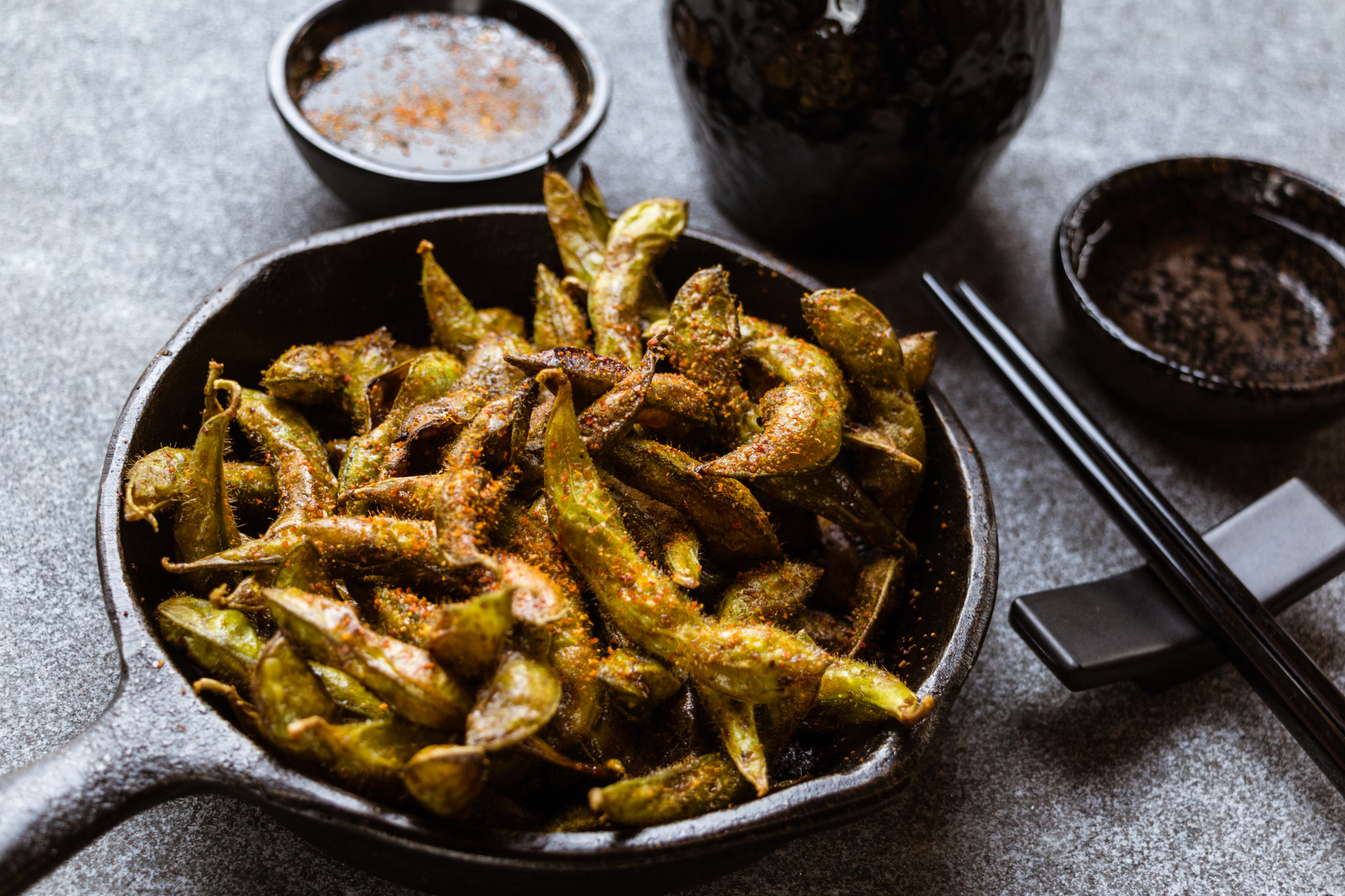 Brotes de soya fritos 200 g, salsa de soya de la casa y togarashi.