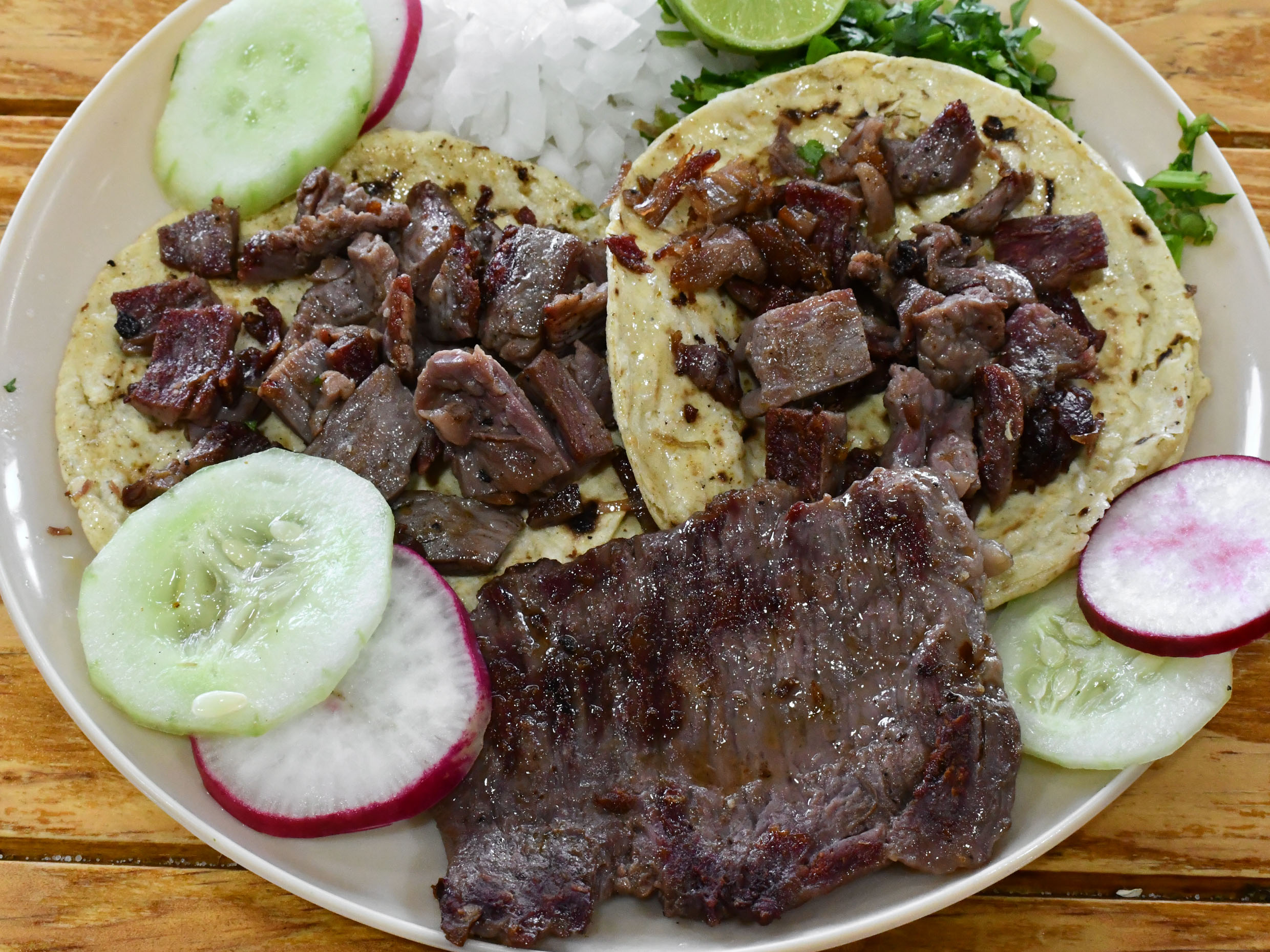 Delicioso taco de arrachera, acompañado de verduras y salsas.
