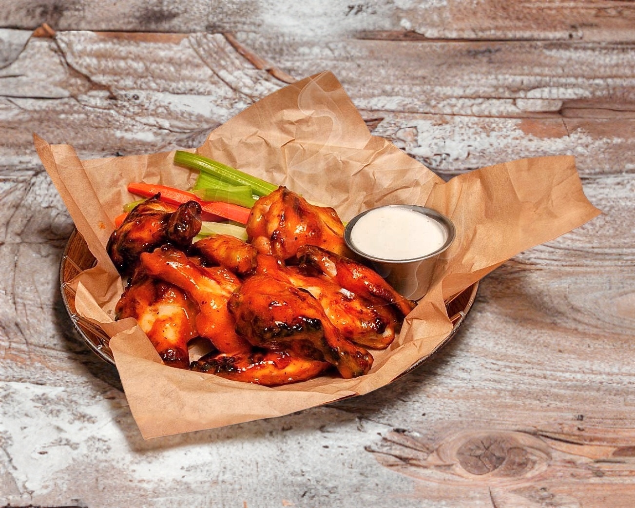 1 Kilo de Alitas Crujientes Bañadas en Salsa a tu Elección, Acompañadas de Bastones Frescos de Zanahoria y el Aderezo Ranch de la Casa.