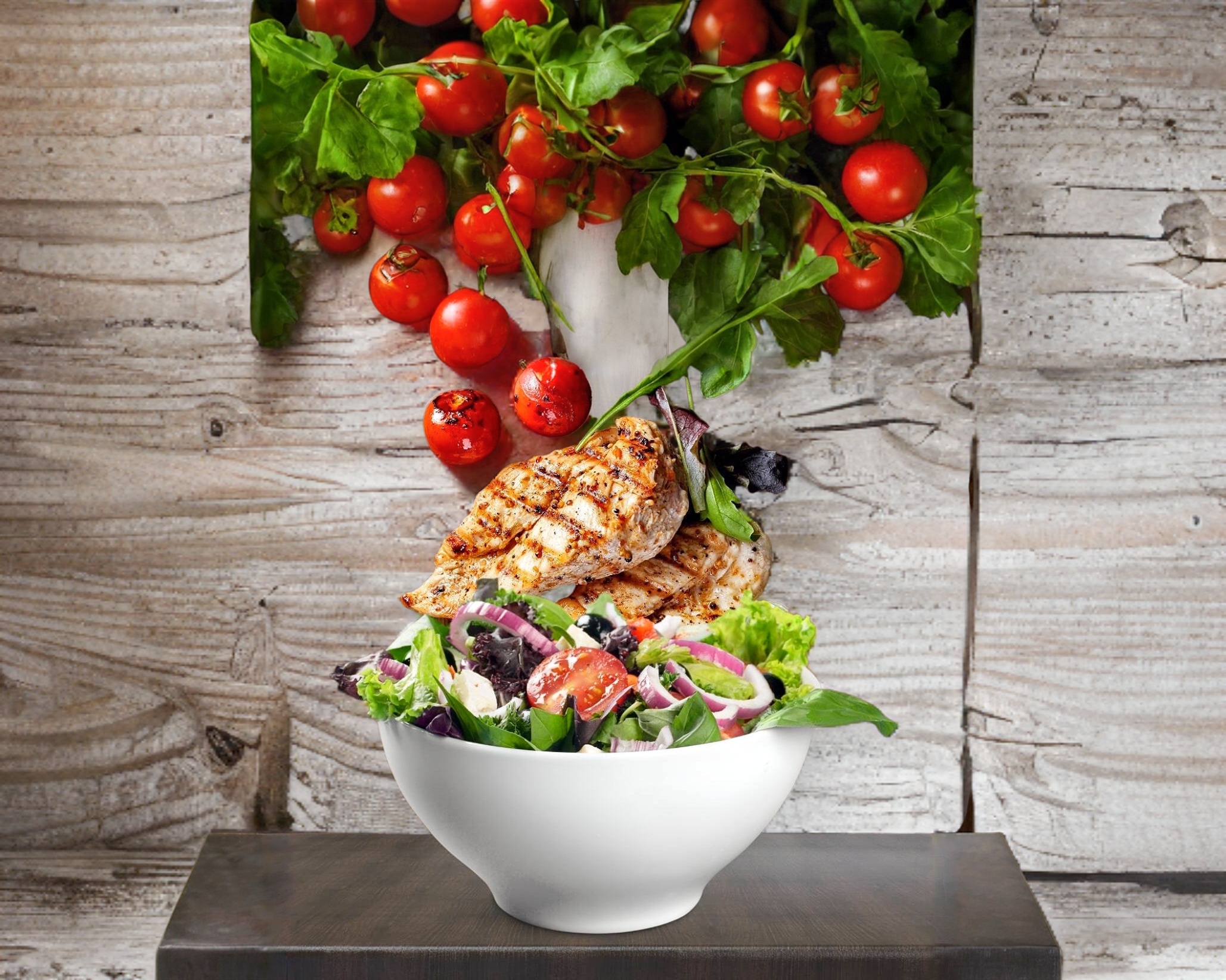 Mix de Lechuga y Espinaca Fresca, Jitomate Cherry, y Cebolla Morada Coronada con Jugosa Pechuga de Pollo Marinada a la Plancha en Nuestra Vinagreta de la Casa.