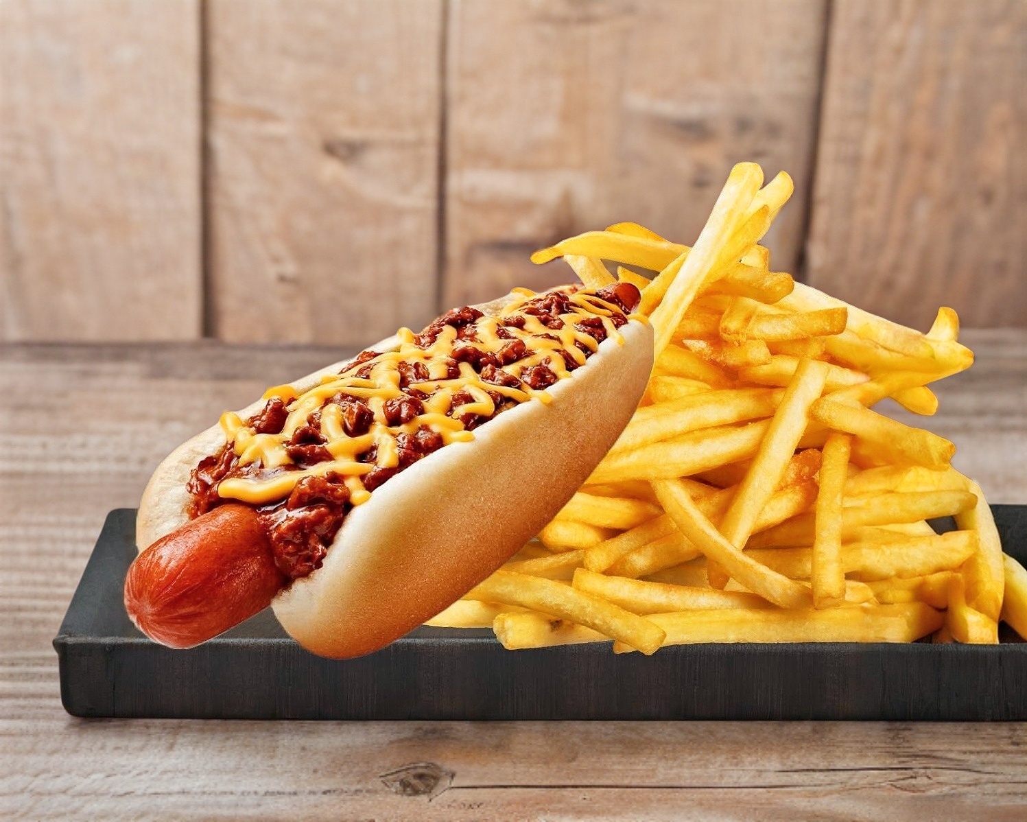 Salchicha de Pavo Envuelta en Crujiente Tocino,Cubierto con Delicioso Queso y Chorizo, Acompañado de Crujientes Papas a la Francesa.