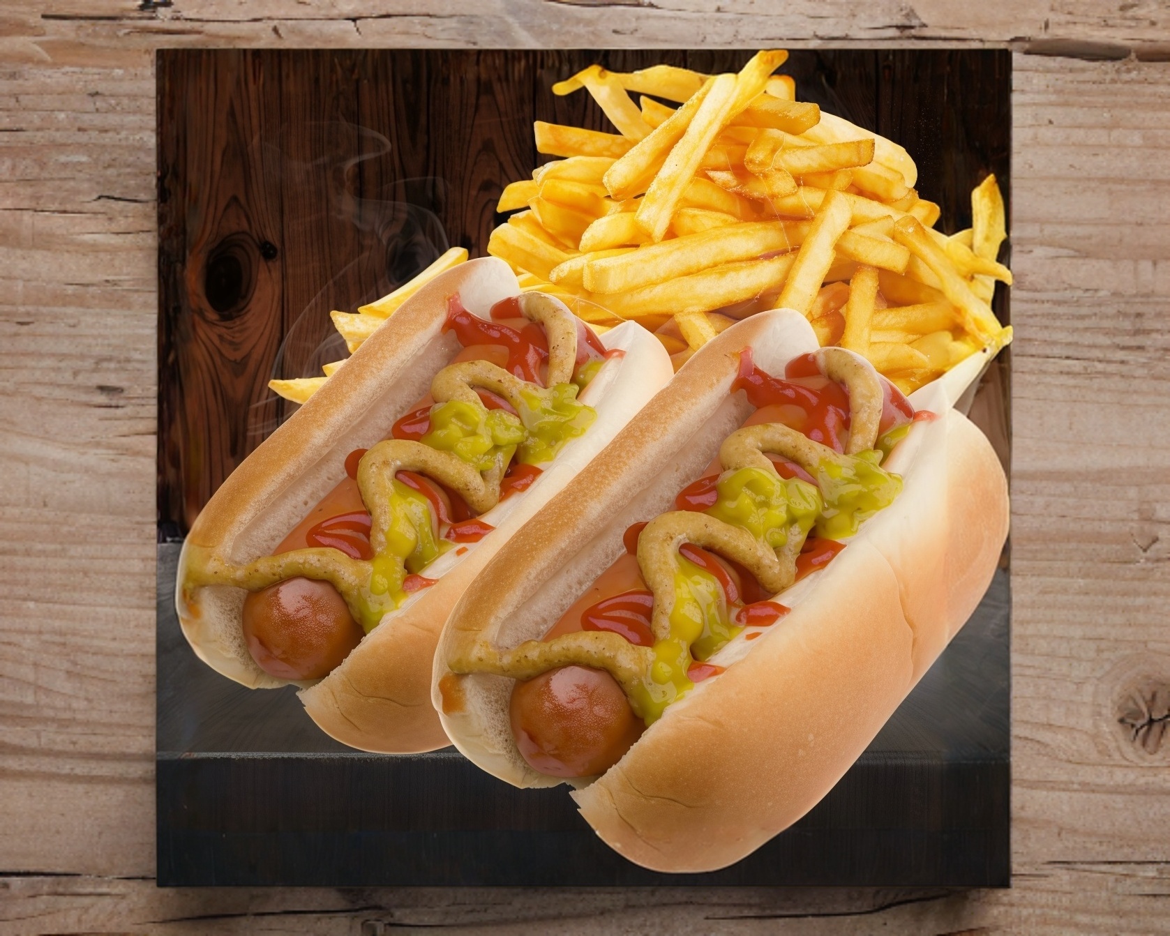2 Dogos con Salchicha de Pavo Envuelta en Tocino Crujiente,Acompañado de Crujientes Papas a la Francesa.