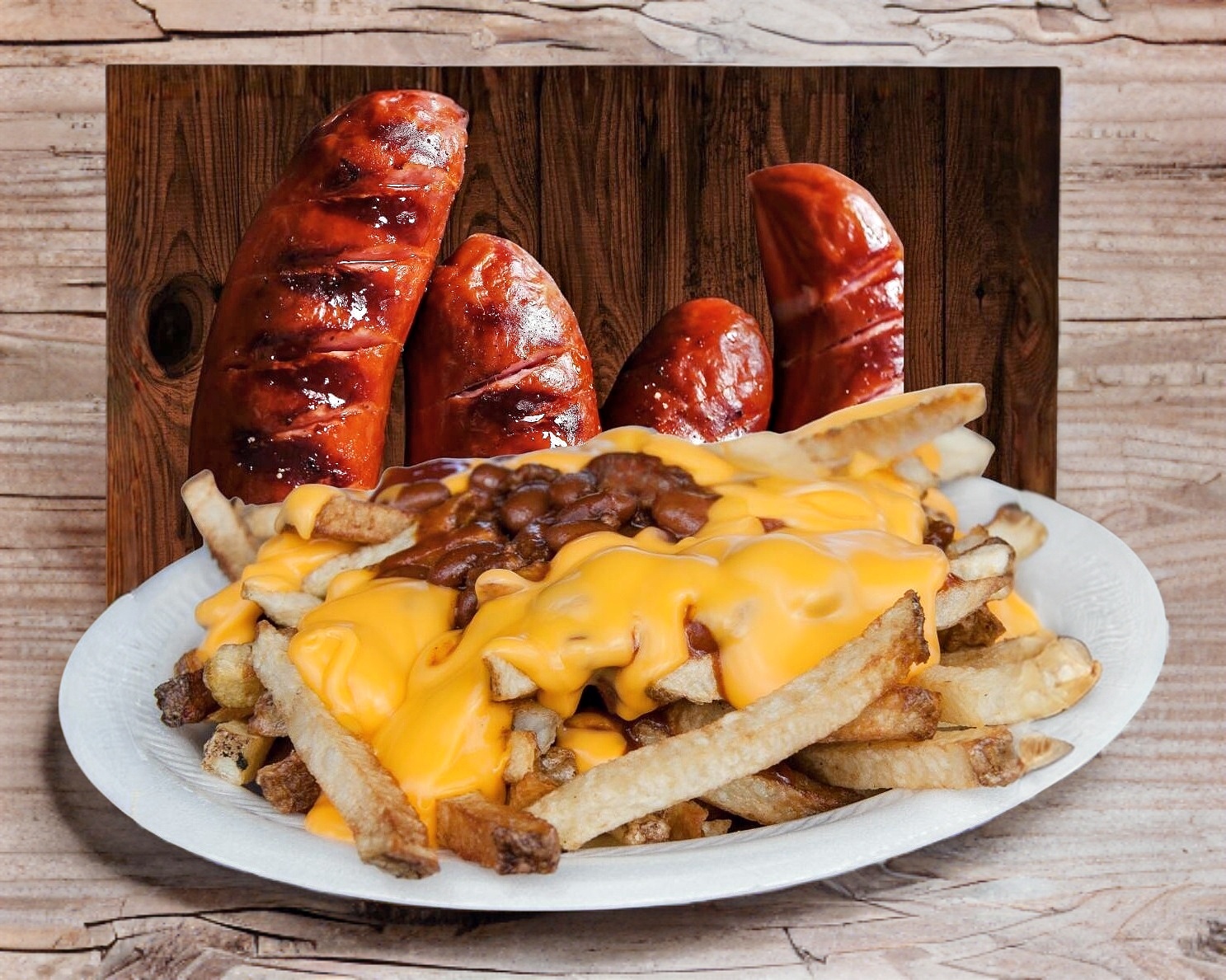 Crujientes Papas a la Francesa,Cubiertas con Queso Amarillo, Crujientes Trozos de Tocino y Chorizo.