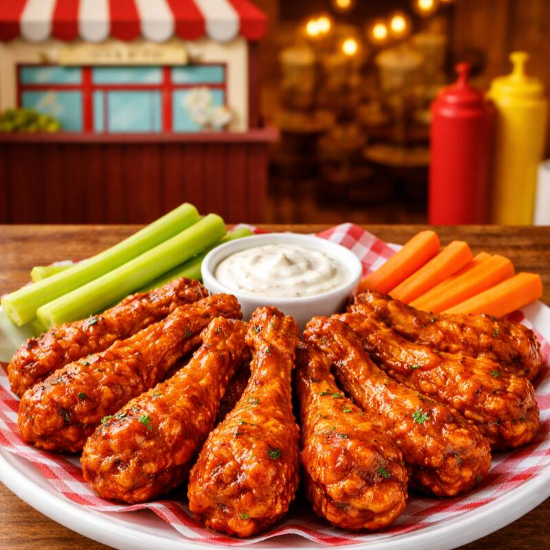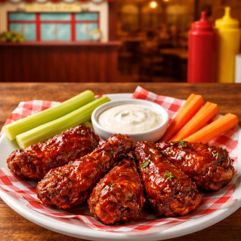 6 Deliciosas Alitas Bañadas en tu salsa favorita, aderezo Ranch y vegetales.