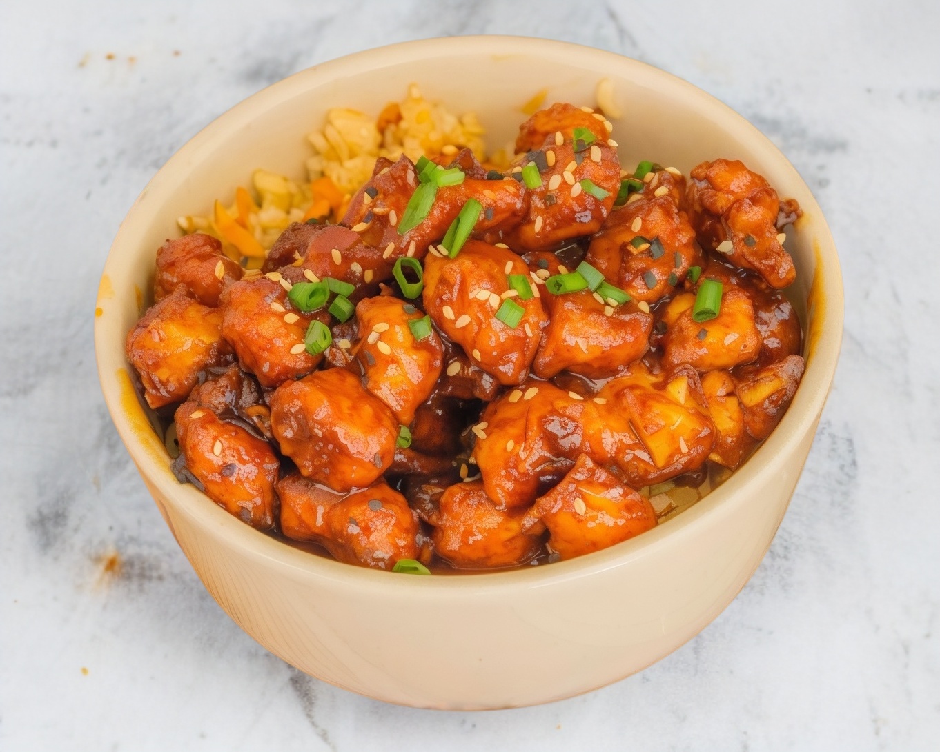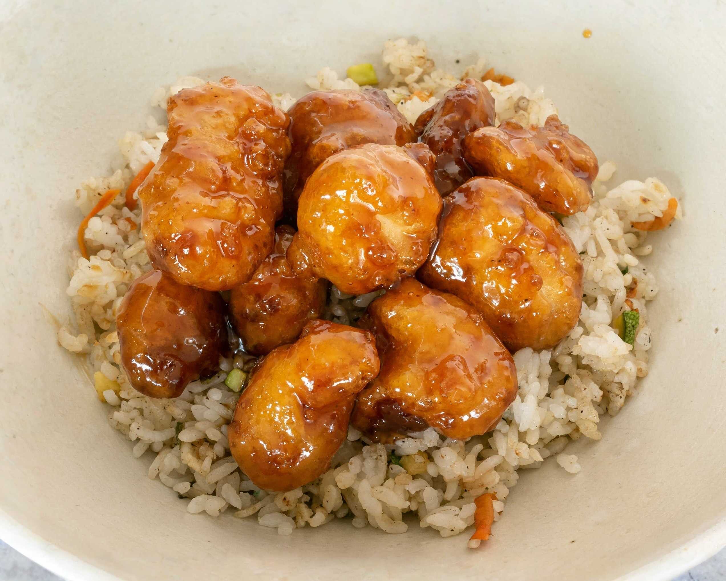 cubitos de pechuga capeada y glaseada con salsa de naranja agridulce, guarnicion a elegir.