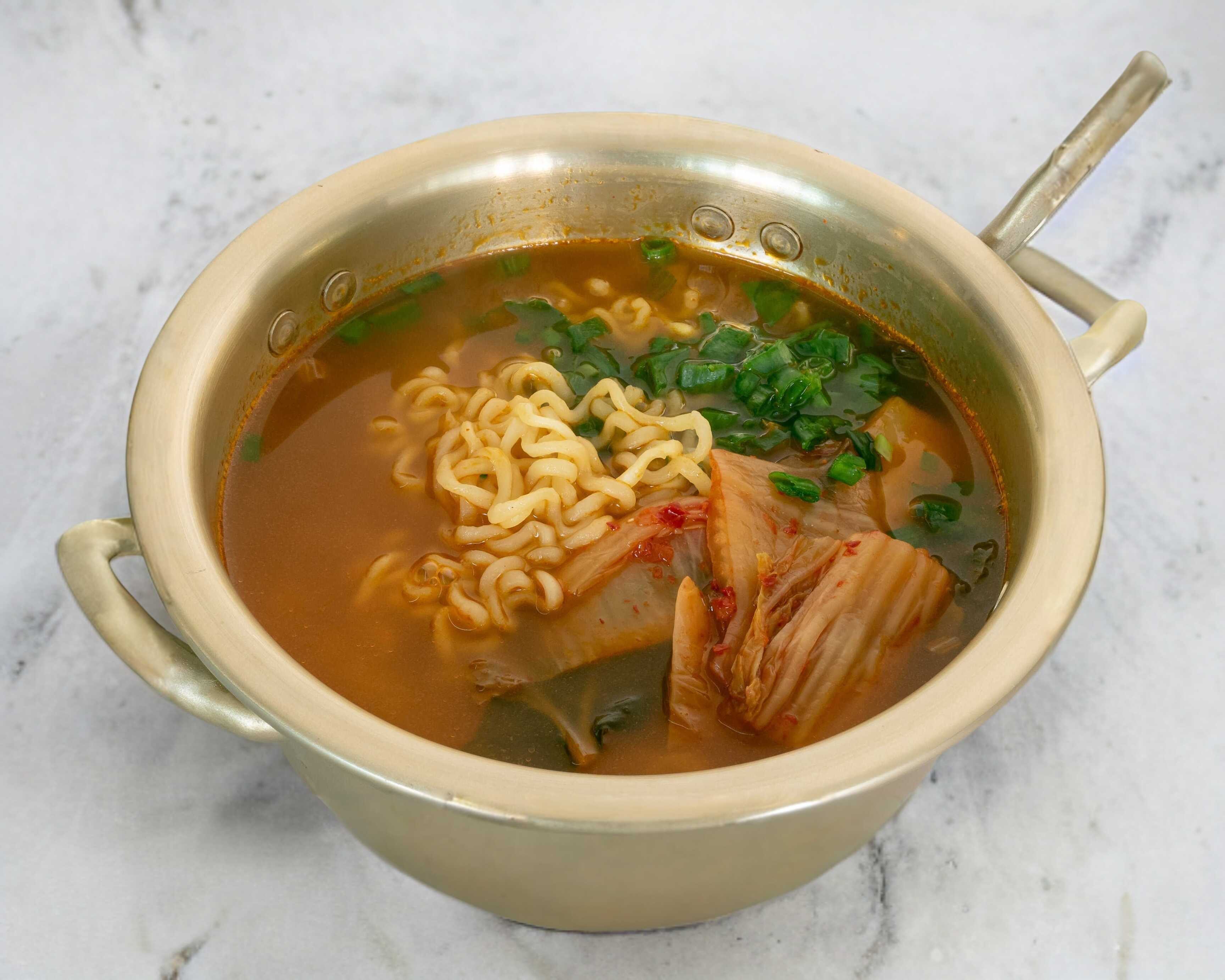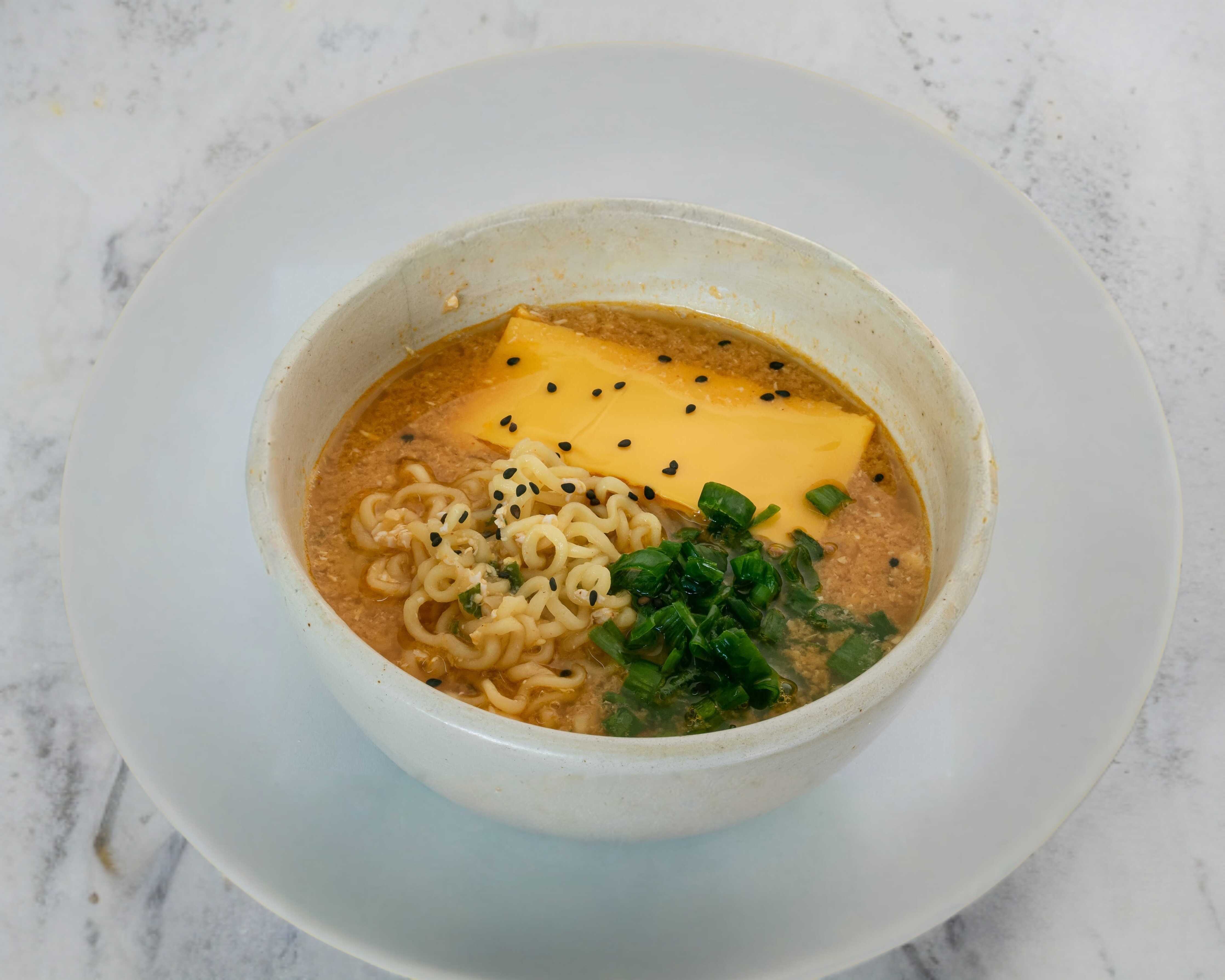 fideos en caldo picosito, con panceta de cerdo tipo chashu.