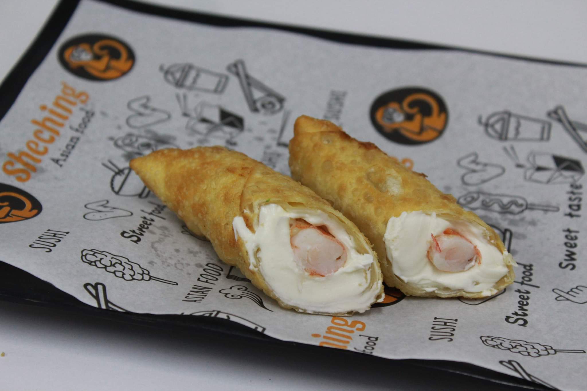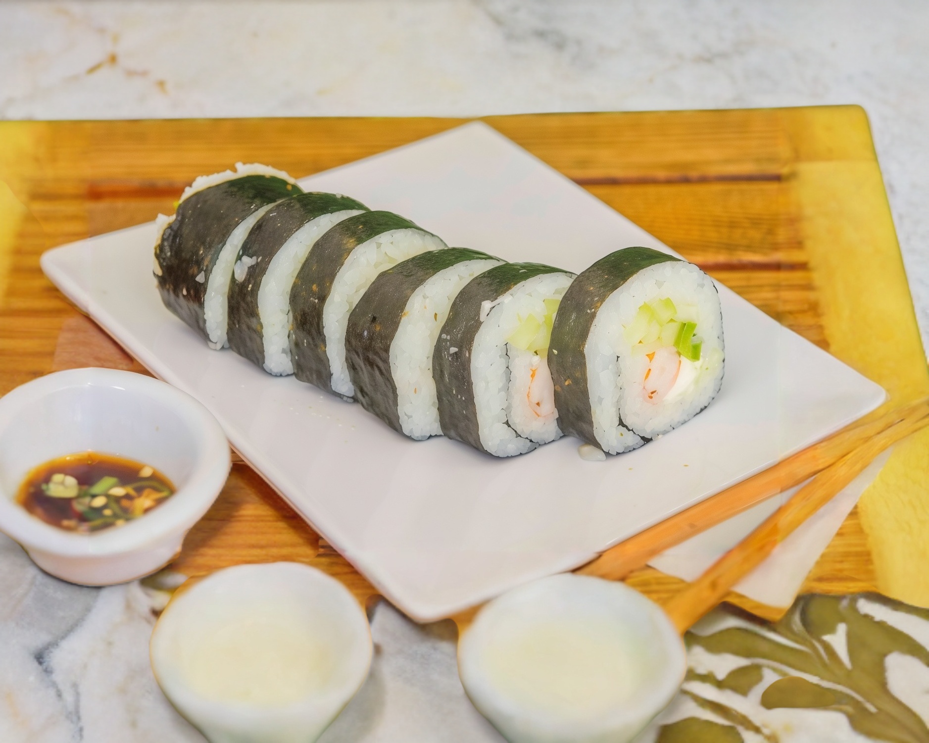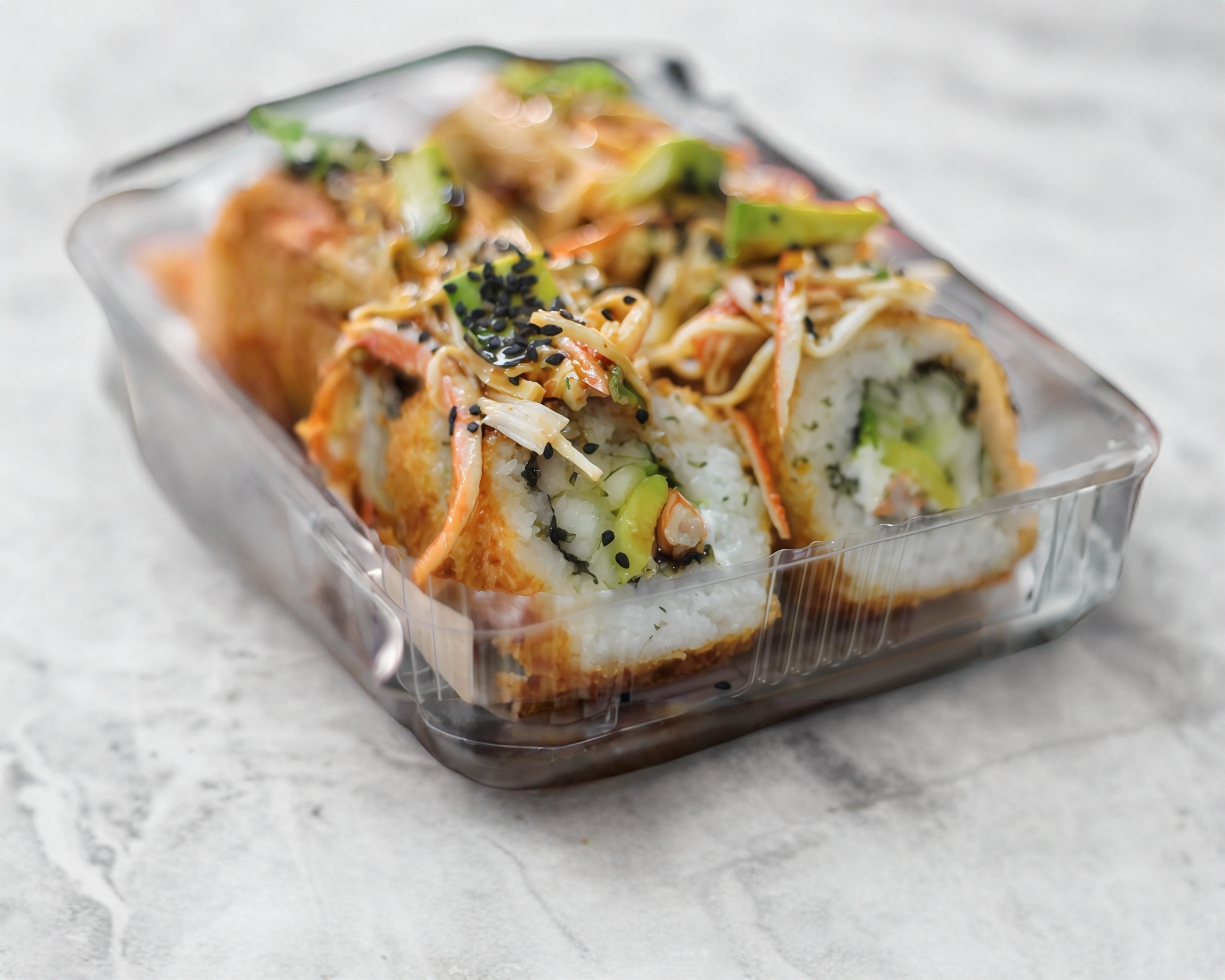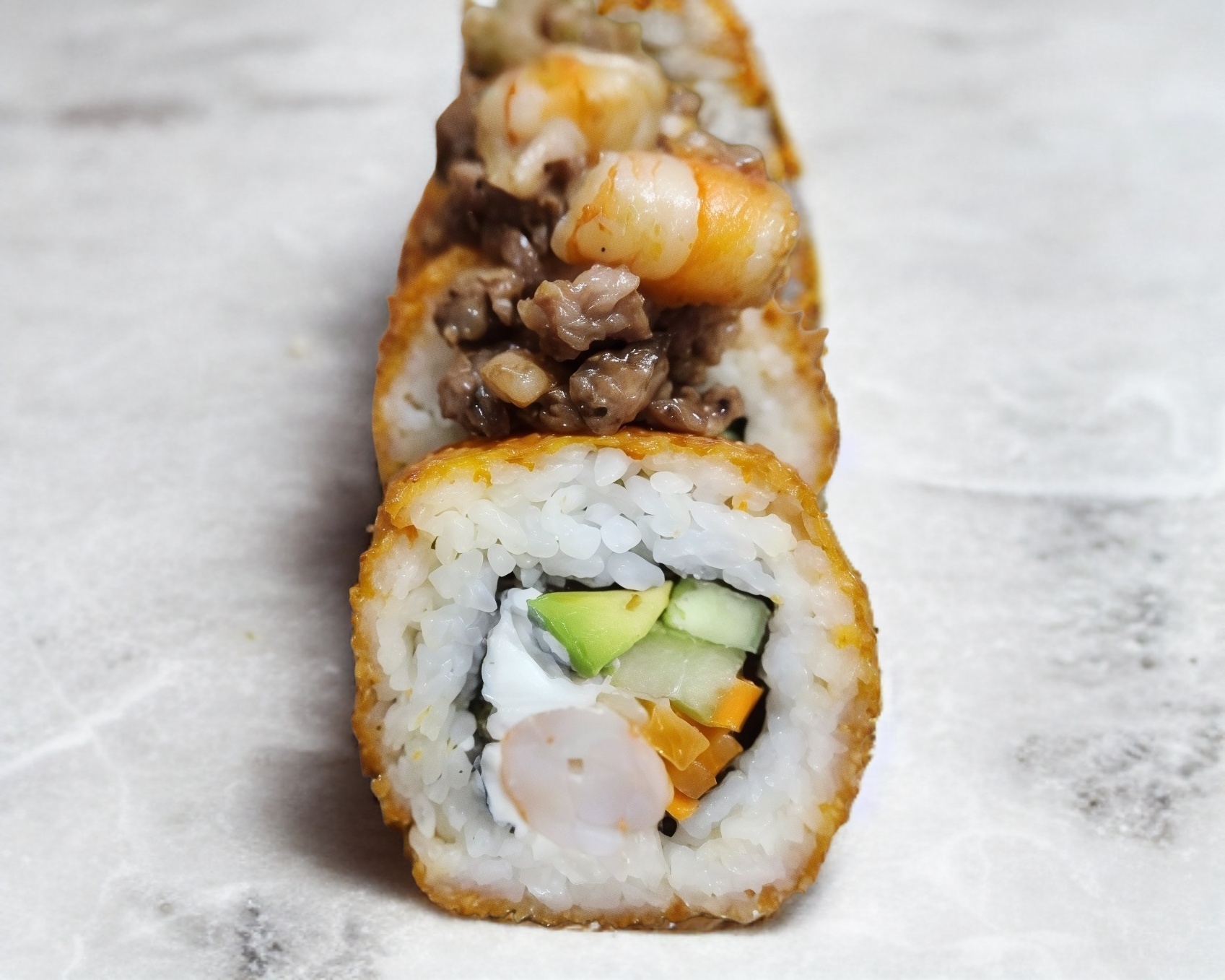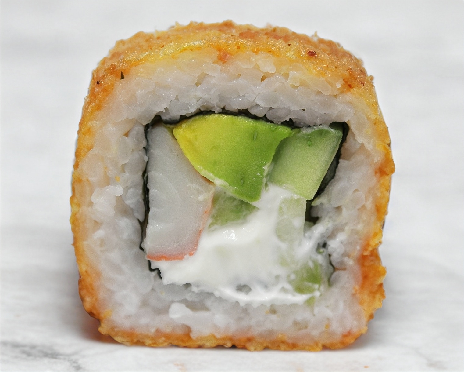 por dentro queso, pepino, aguacate y queso phila. Por fuera empanizado con topping de grenñitas de surimi.