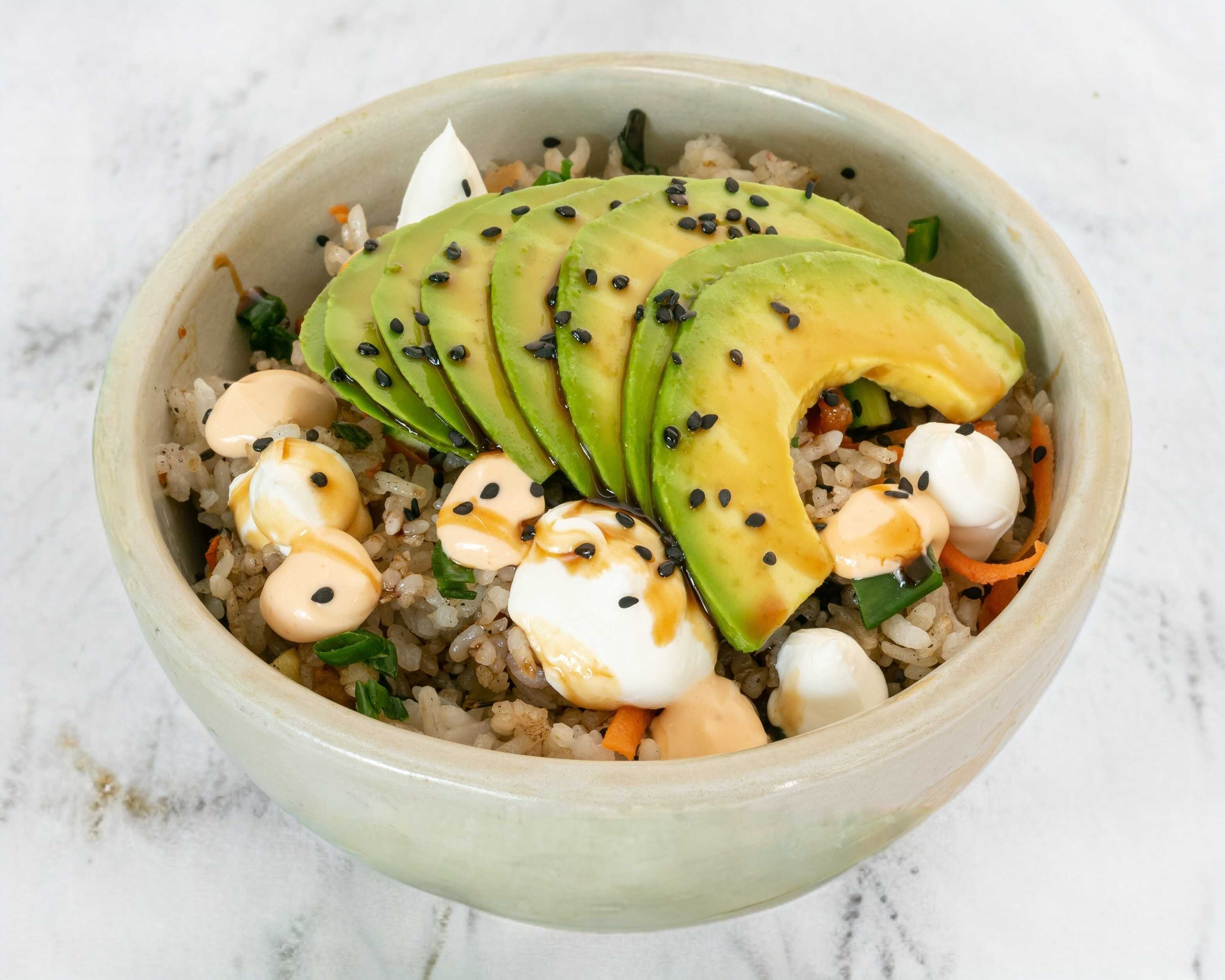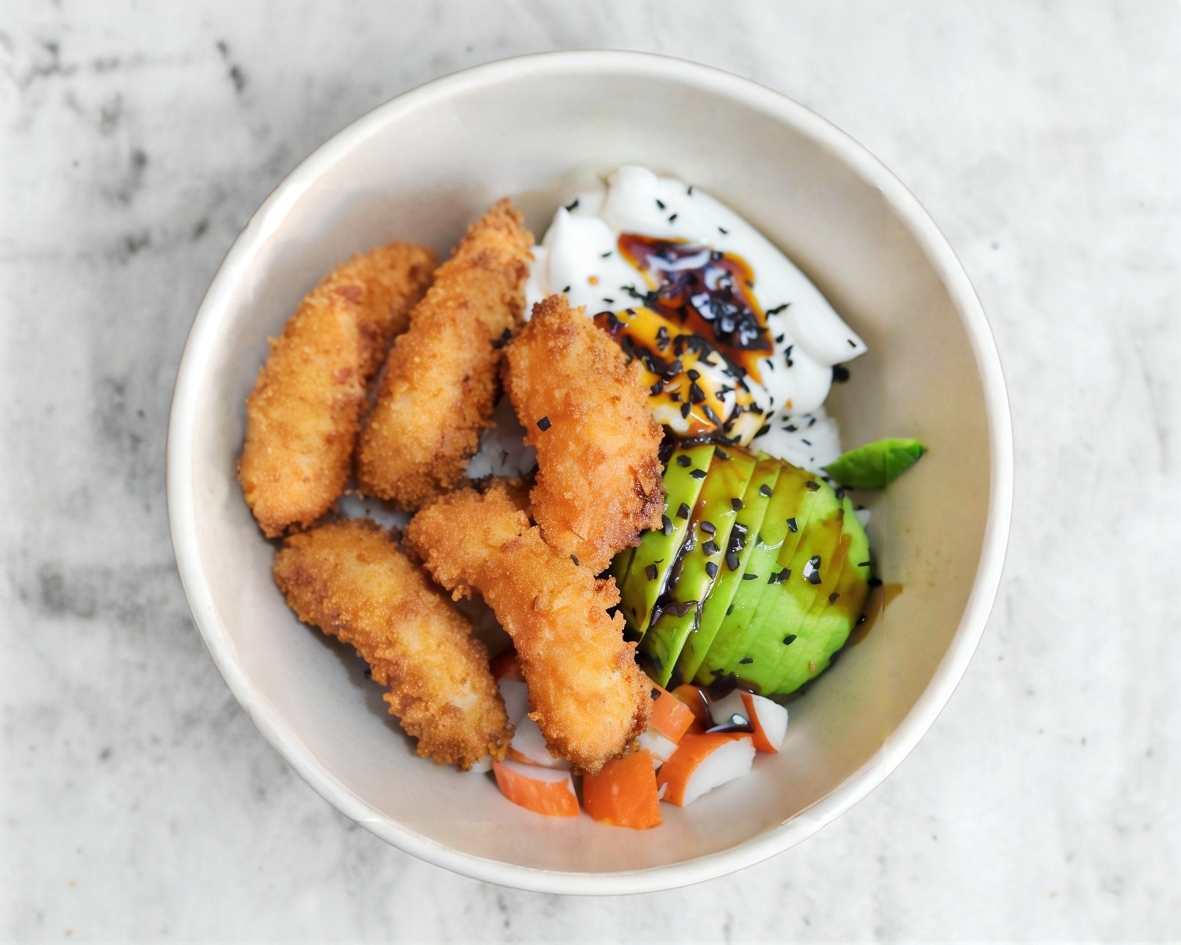 bowl con base de arroz blanco de topping camarones empanizados, queso phila, aguacate y surimi.