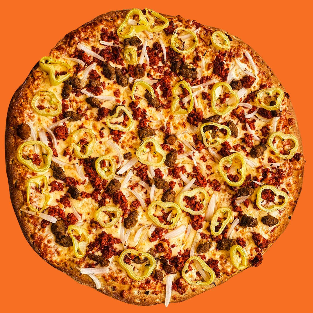 Trozos de carne al pastor, chorizo 100% mexicano, cebolla fresca aderezo de cilantro.
