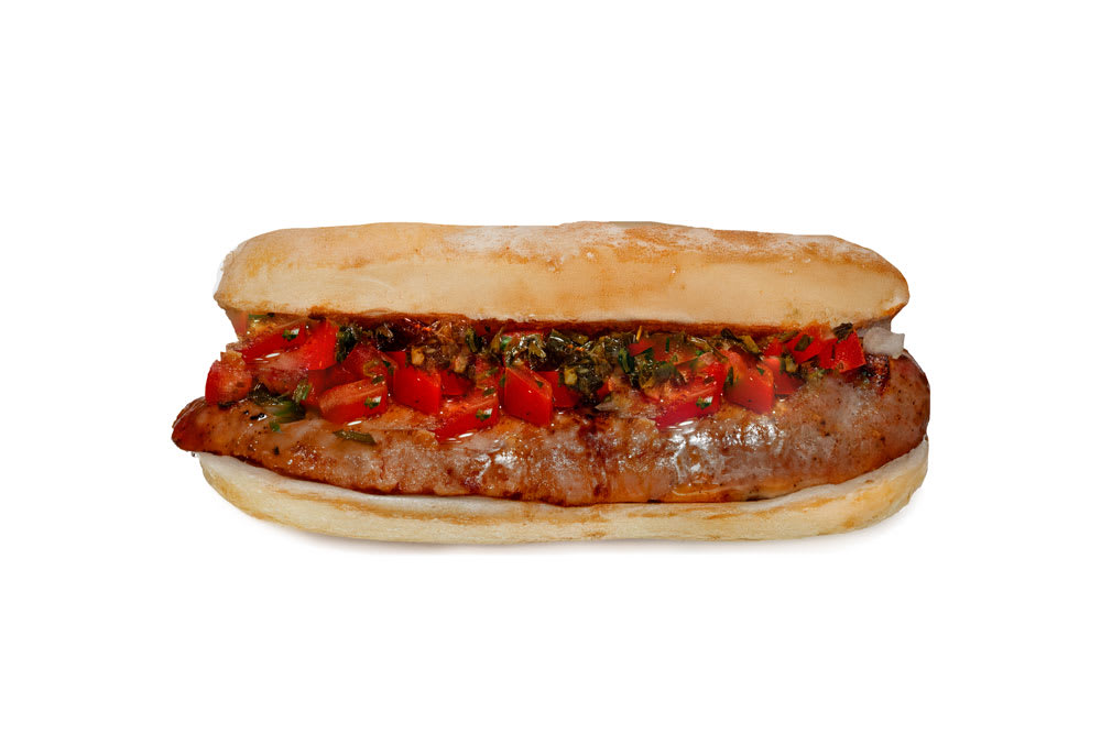 Chorizo artesanal estilo búfalo cocinado a las brasas y servido en pan de especialidad hecho con masa madre