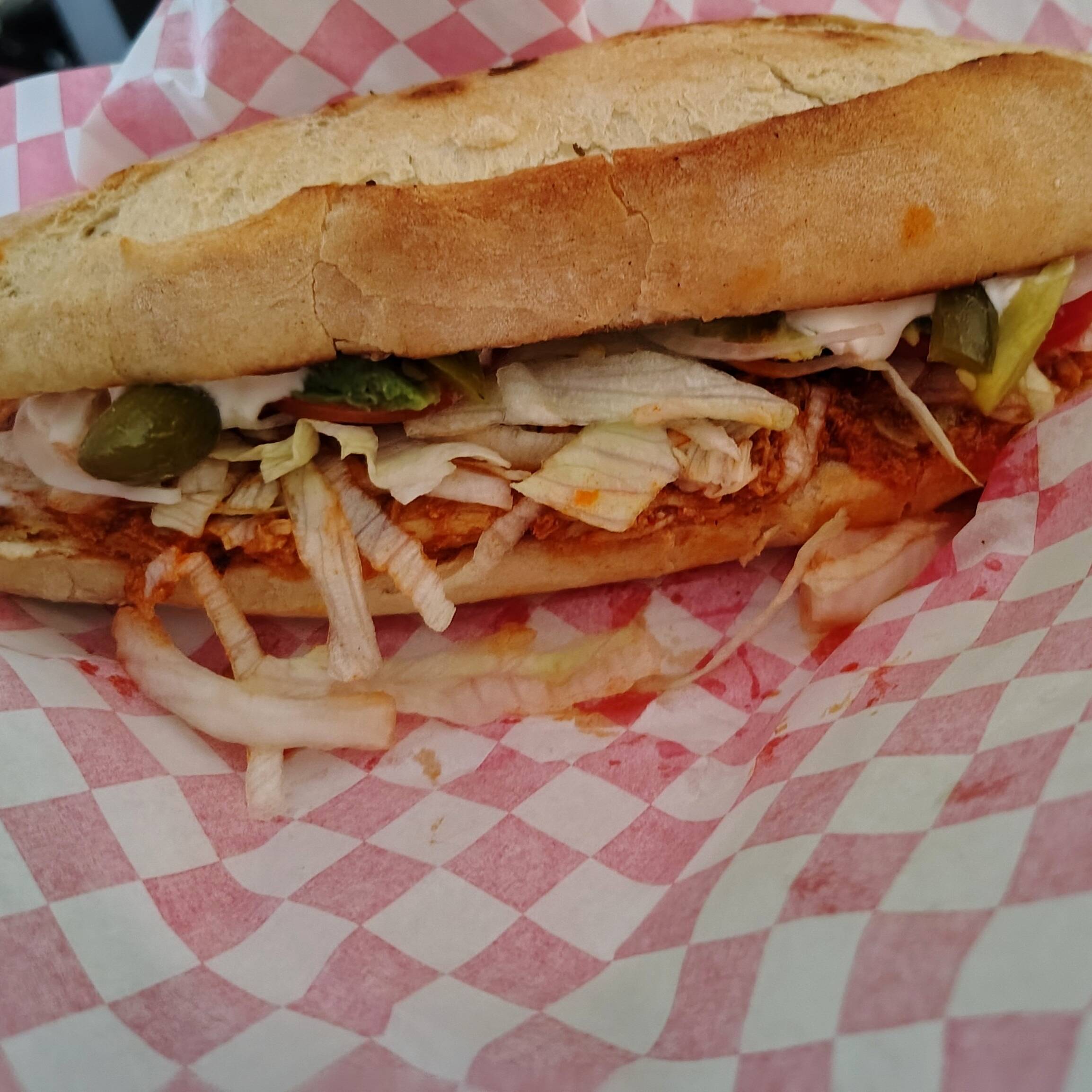 milanesa pollo, jitomate, lechuga, cebolla, jalapeño,aguacate.