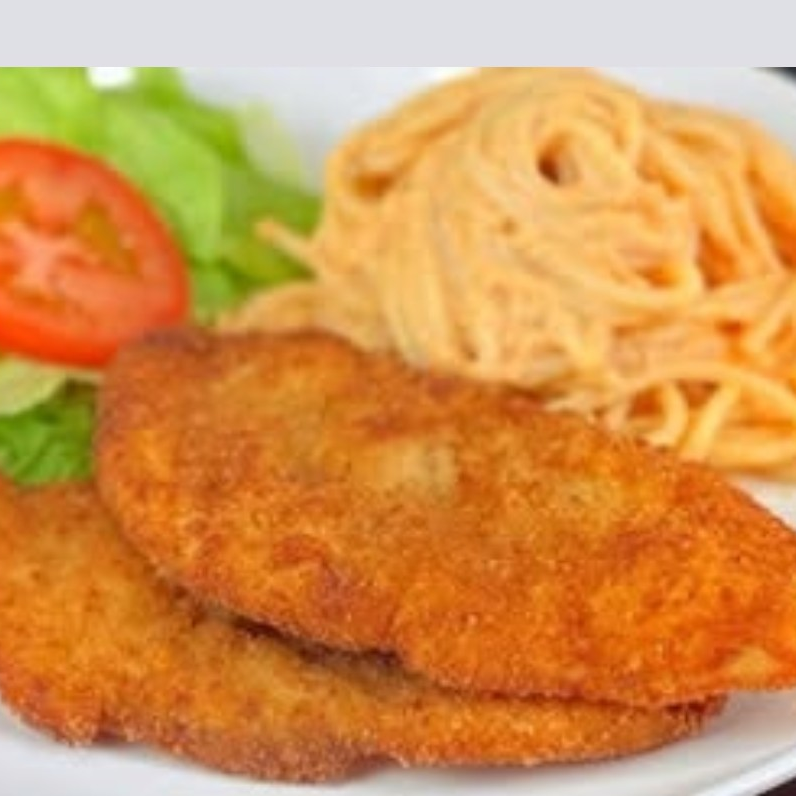 Milanesa de pollo o res empanizada, ensalada de lechuga, jitomate y cebolla, espaguetti, tortilla.