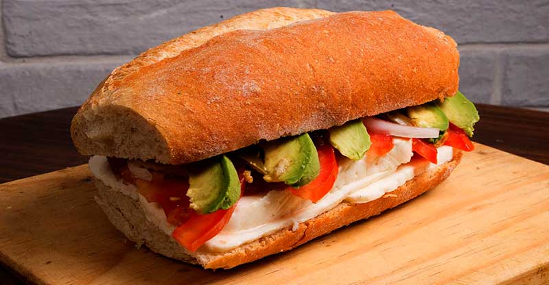 Sándwich caliente con deliciosa panela, crema, con fresco jitomate, lechuga, cebolla, jalapeño y una pizca de mostaza y mayonesa.